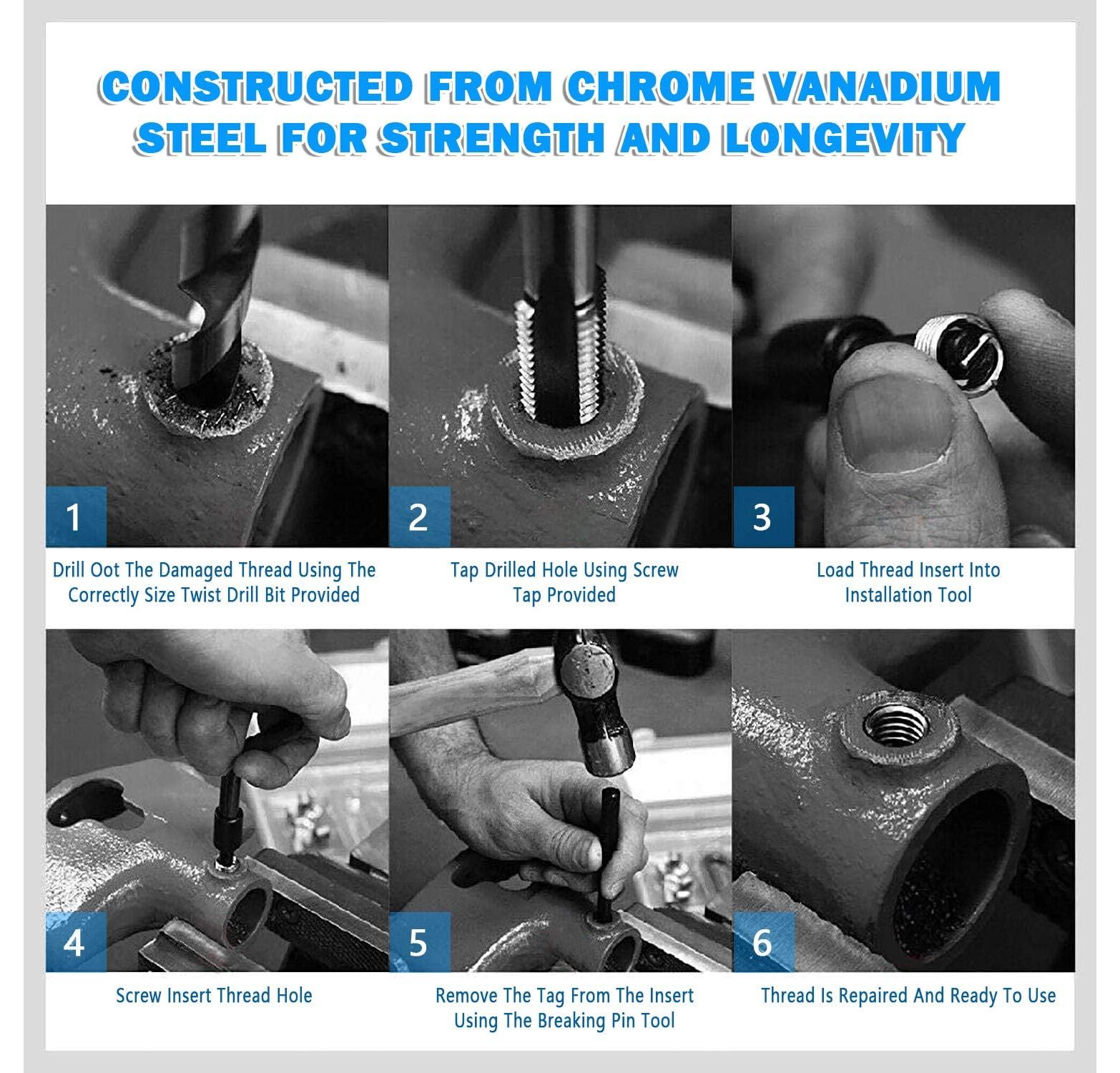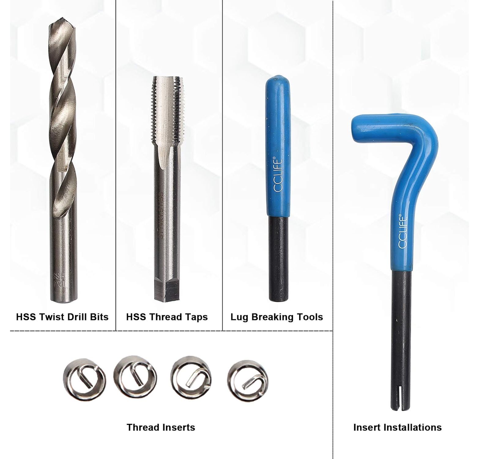 - Lieferumfang: Spiralbohrer zum Aufbohren der defekten Gewinde; Gewindebohrer; 10 x Einsetzwerkzeug zur Montage der Reparatureinsätze; Zapfenbrecher zum Entfernen der Eindrehzapfen