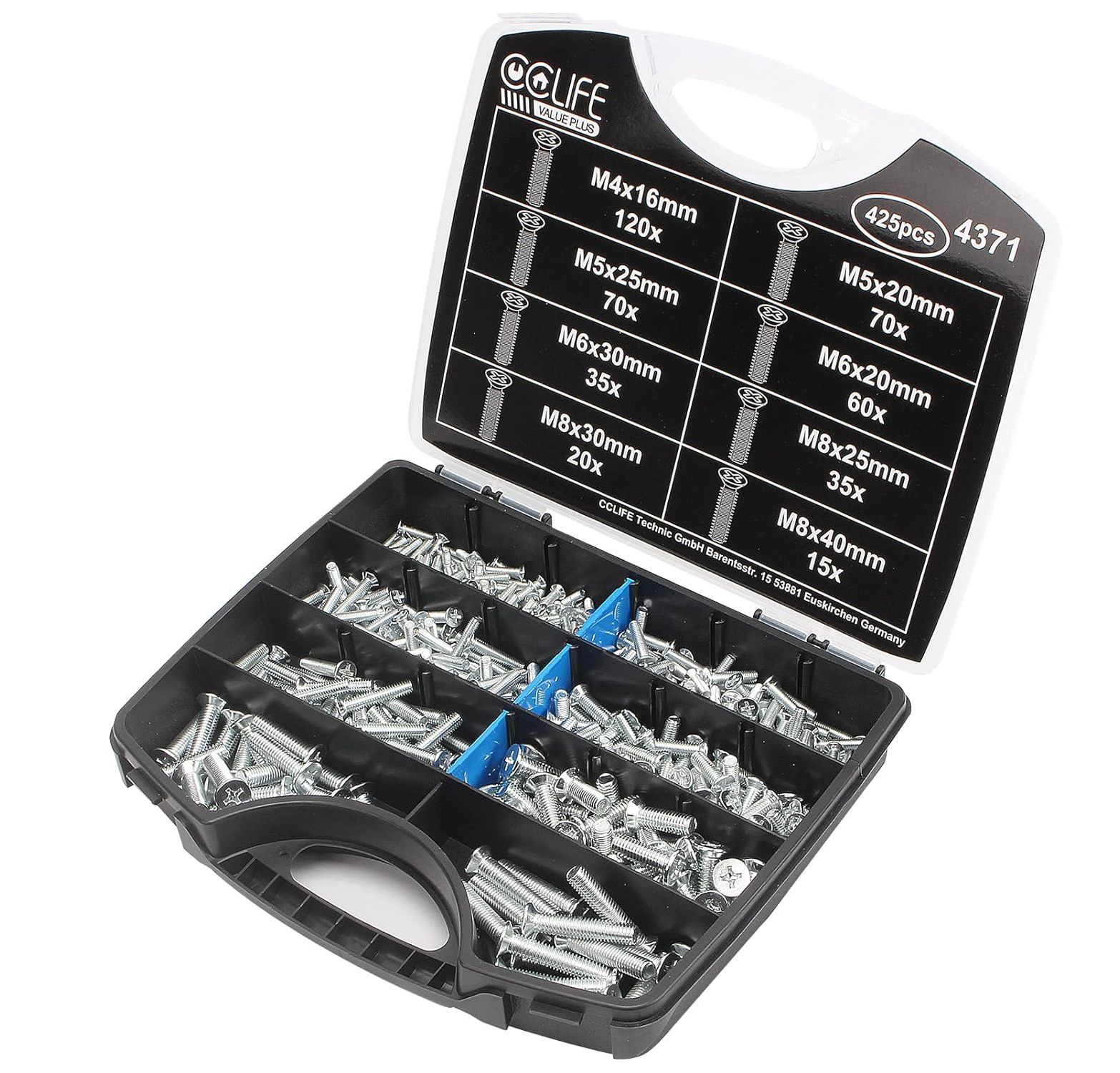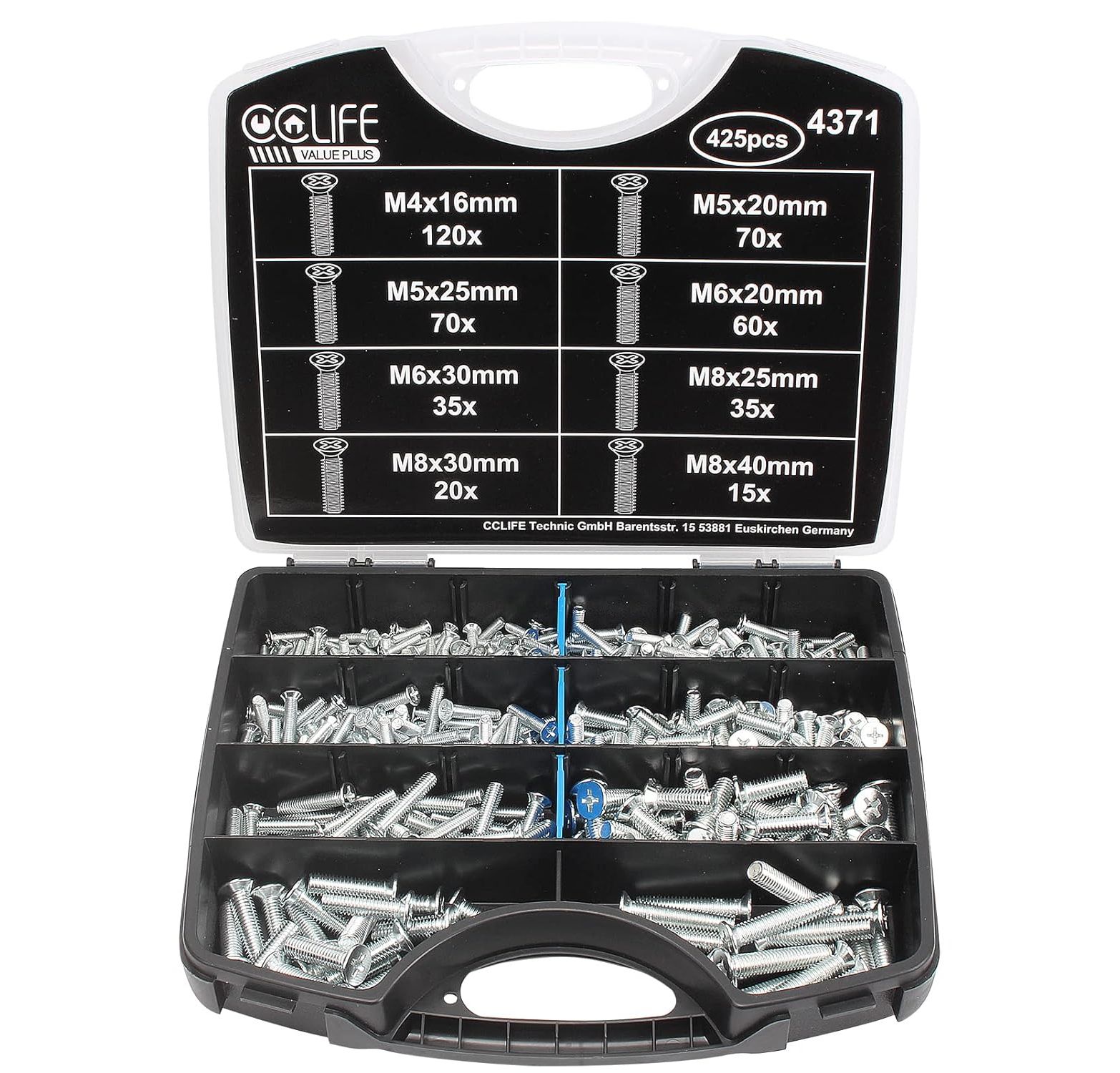 CCLIFE 425tlg Schrauben Set, Kreuschlitz Senkkopfschrauben DIN 965 Flach Knopf Stahl Verzinkt M4 M5 M6 M8