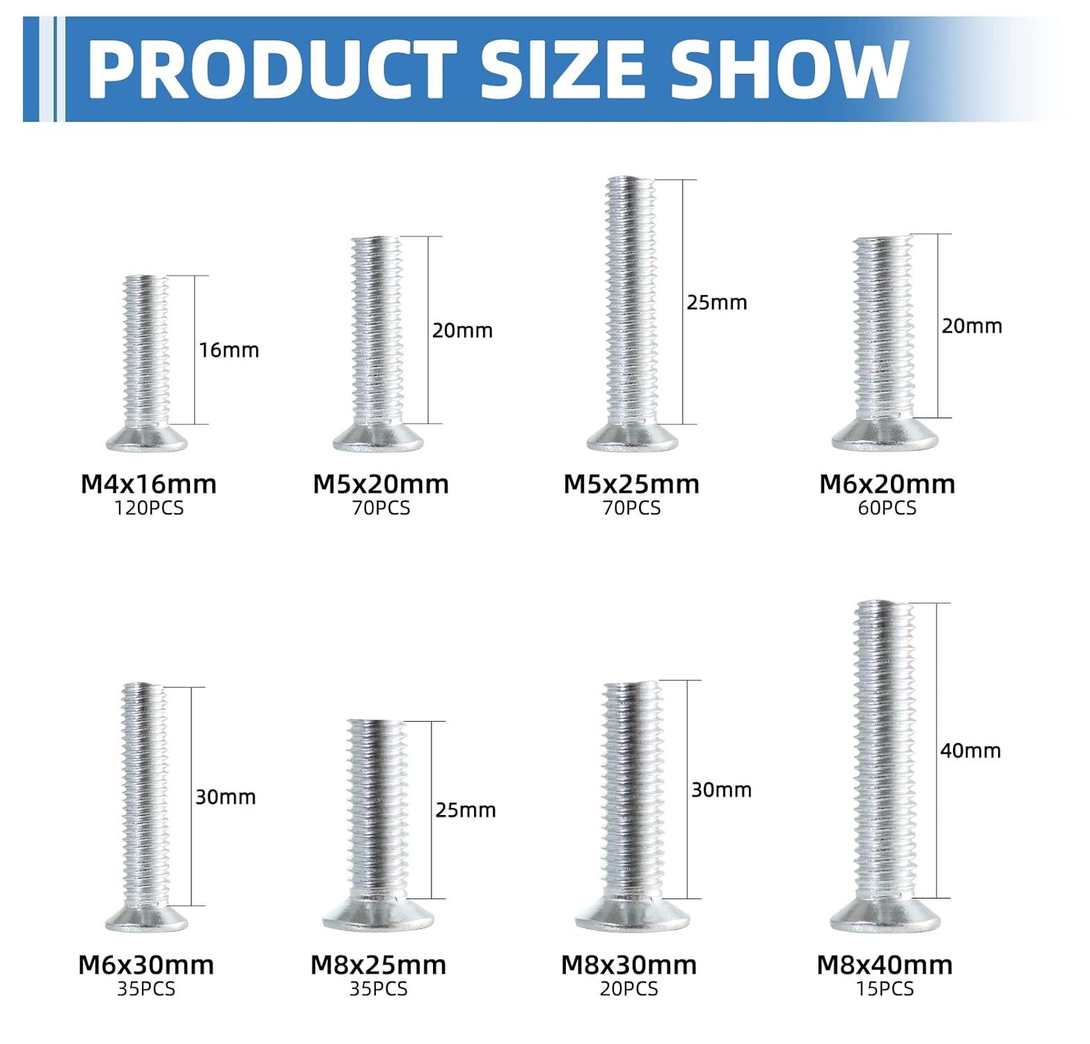 • Inhalt: Das Produkt enthält 425 Senkkopfschrauben, erhältlich in 8 Größen: M4 * 16 mm, M5 * 20 mm / 25 mm, M6 * 20 mm / 30 mm, M8 * 25 mm / 30 mm / 40 mm, verschiedene Größen können die Anforderungen des täglichen Gebrauchs erfüllen.