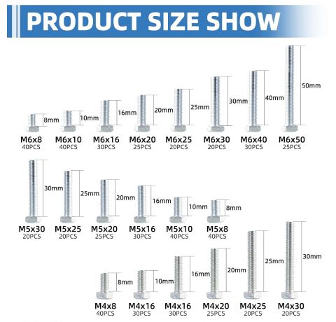 • Inhalt: Das Produkt enthält 580 Sechskantschraubensätze mit 20 Größen: M4*8mm/10mm/16mm/20mm/25mm/30mm, M5*8mm/10mm/16mm/20mm/25mm/30mm, M6*8mm/10mm / 16 mm/20 mm/25 mm/30 mm/40 mm/50 mm, verschiedene Größen können die Anforderungen des täglichen Gebrauchs erfüllen.
