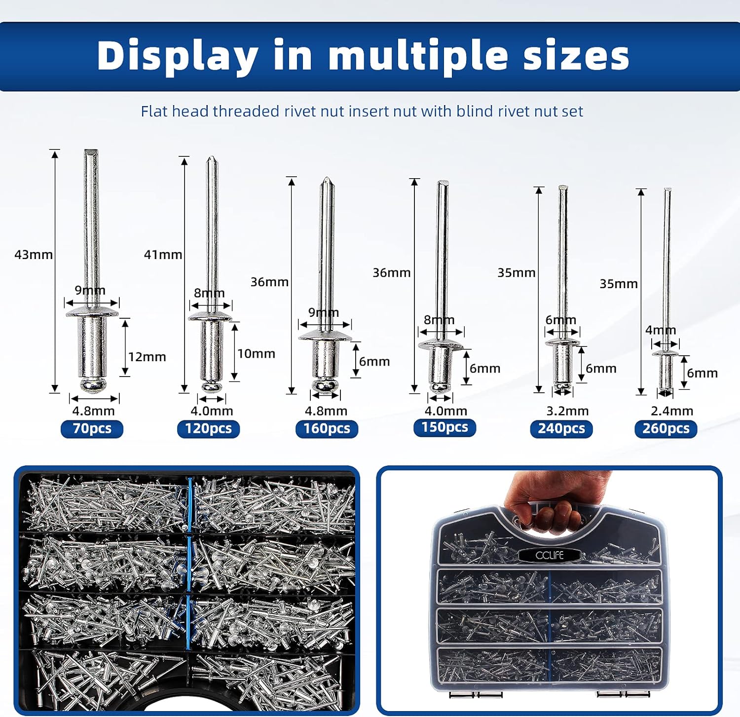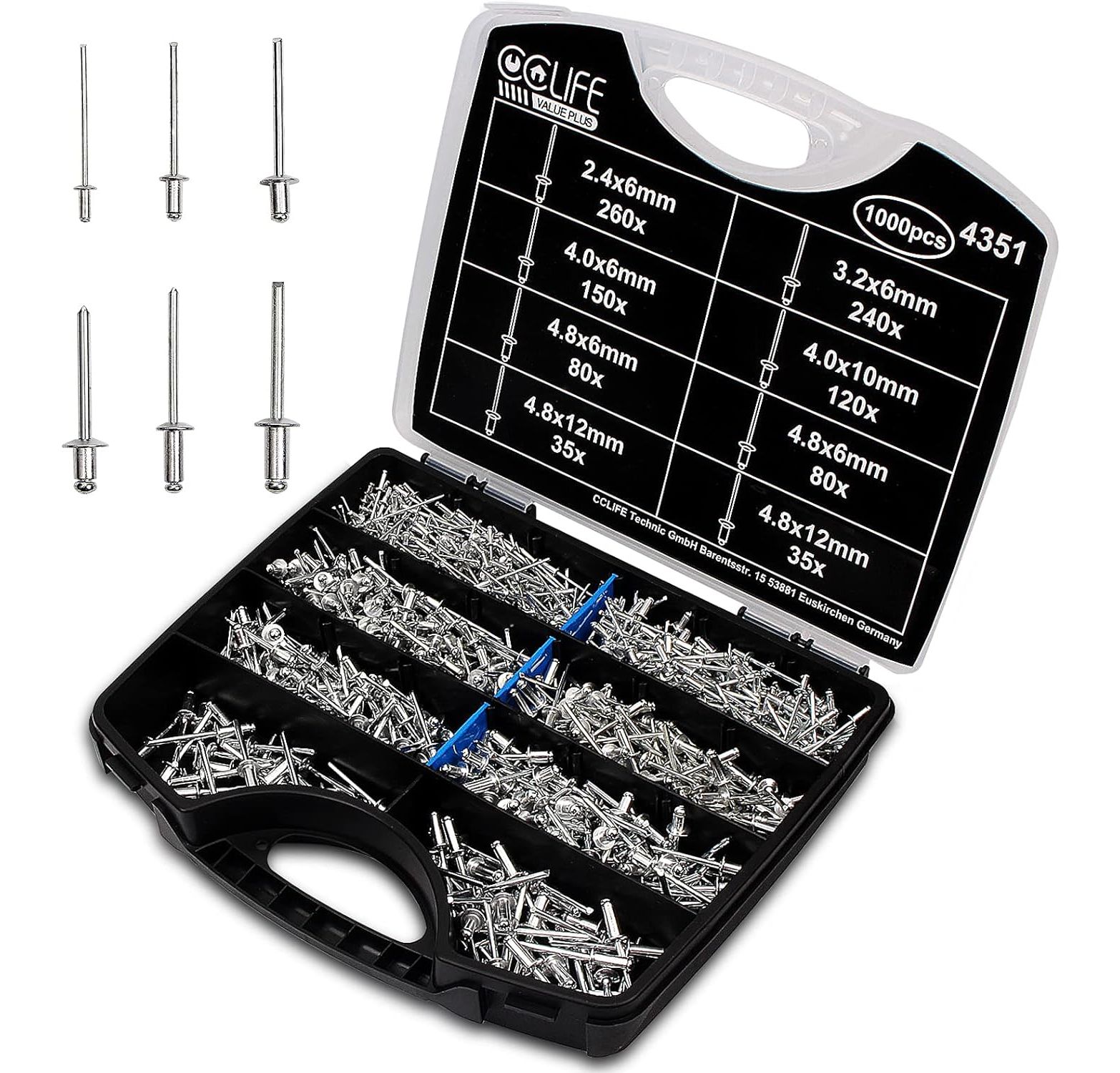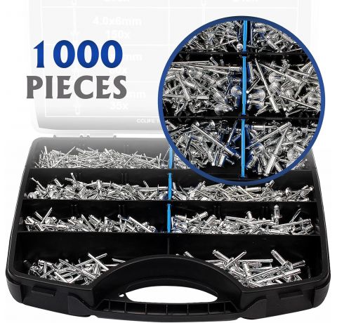 CCLIFE 1000tlg Nieten Alu Blindnieten Sortiment Popnieten Stahlniete 2,4-3,2-4-4,8mm
