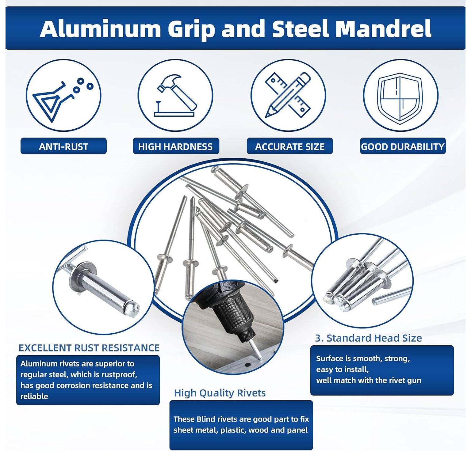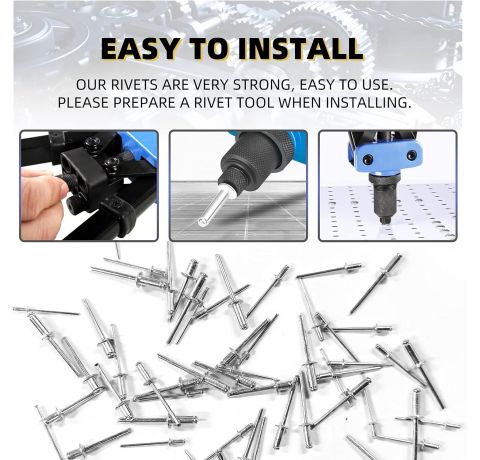 - Praktisch:Unsere Aluminium-Blindniete haben eine hohe Festigkeit und hohe Scherfestigkeit, sowie hochwertige Aluminiumköpfe und stabile verzinkte Stahldorne.