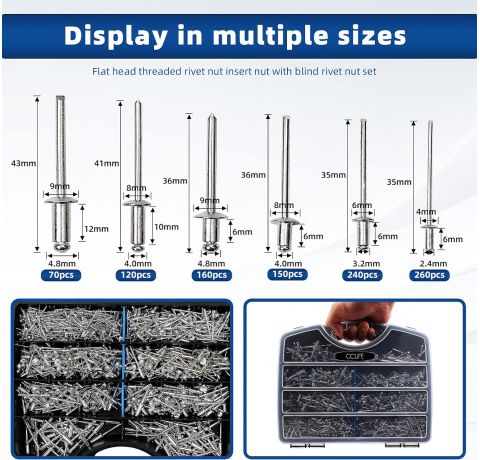 - Inhalt:Das Produkt enthält 1000 Nieten, 260 x 2,4 x 6mm, 240 x 3,2 x 6mm, 150 x 4,0 x 6mm, 120 x 4,0 x 10mm, 160 x 4,8 x 6mm, 70 x 4,8 x 12mm, eine Vielzahl von Größen, die den Anforderungen des täglichen Gebrauchs entsprechen.