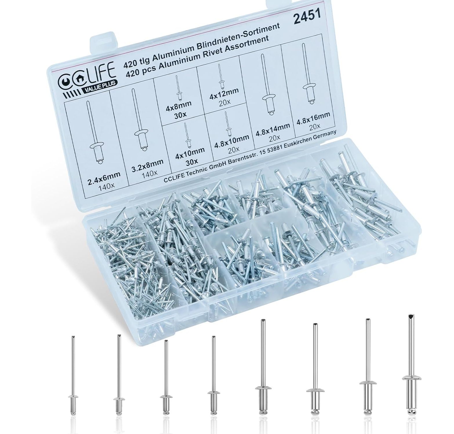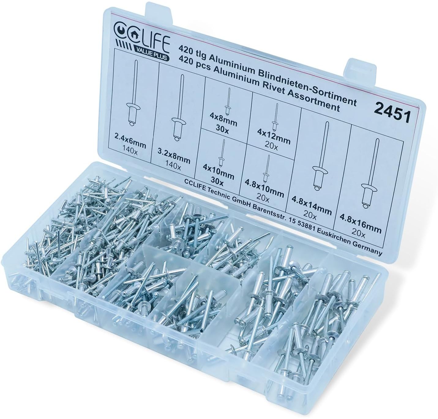 CCLIFE 420 tlg Alu Blindnieten Sortiment Popnieten Set Pop Nieten Stahlniete 2,4 3,2 4 4,8