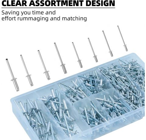 • Ordnung: Unsere Nieten sind in einer gekennzeichneten Sortimentsbox verpackt, in der die Fächer die verschiedenen Nieten in unterschiedlichen Größen getrennt halten, um Verwechslungen zu vermeiden und die Suche und den Transport zu erleichtern.
