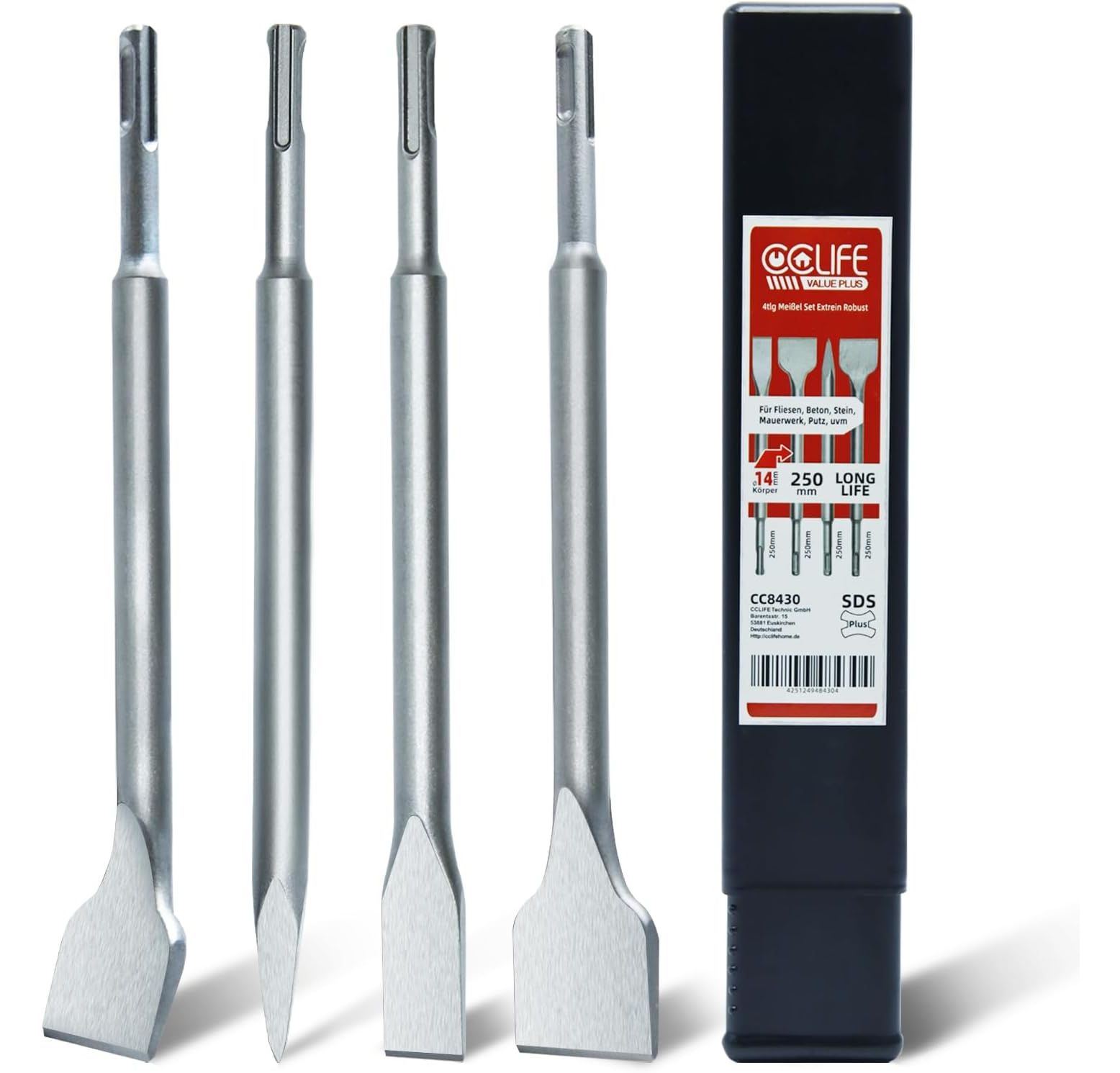 CCLIFE Fliesenmeißel SDS Plus Set 4-tlg,2 x Fliesenmeißel [ 30° angewinkelt und gerade], 1 x Spitzmeißel, 1 x Flachmeißel, 40CR, Leichtes Einspannen & Bruchsicher