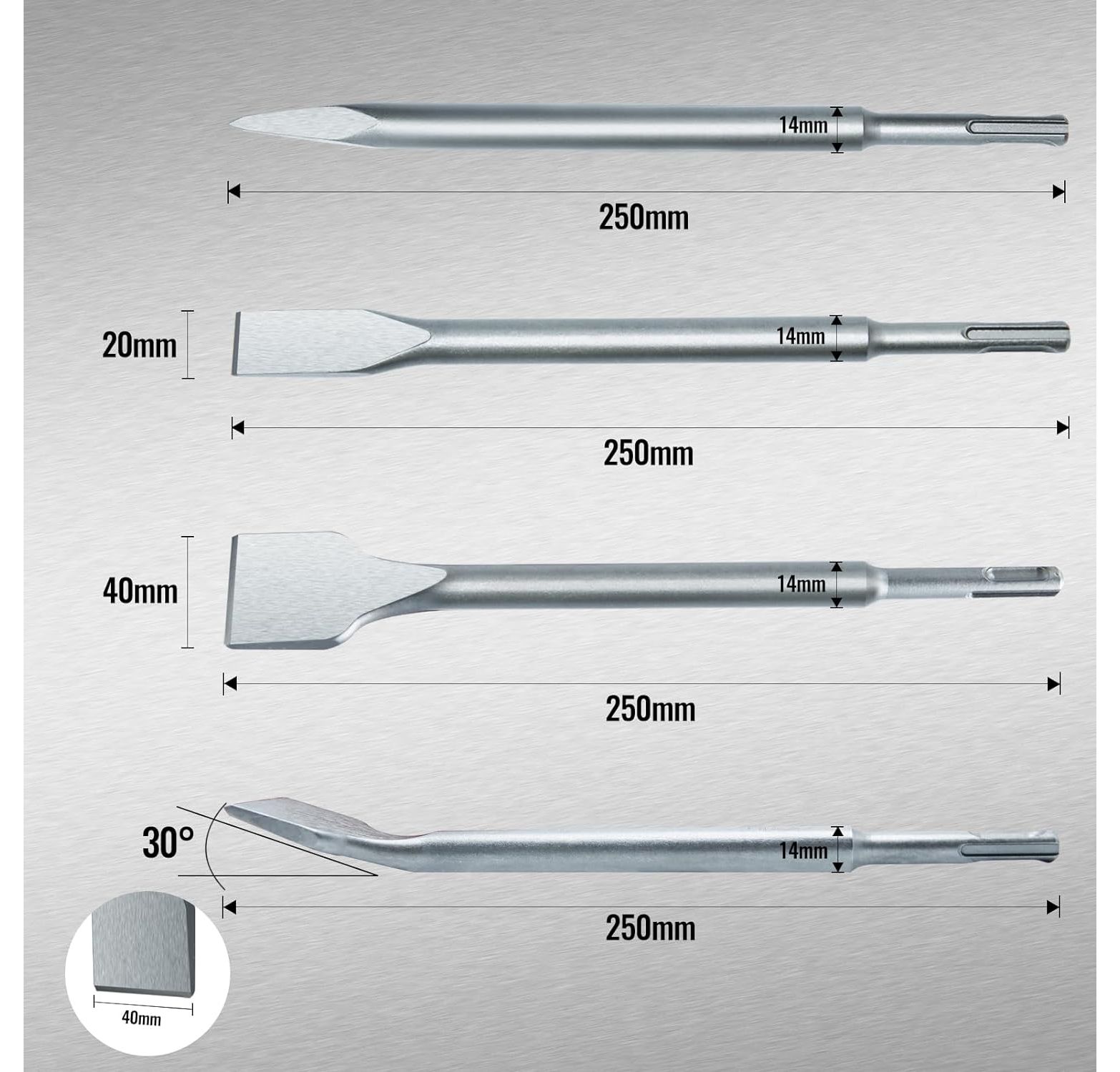- 4-teiliger Meißelsatz SDS: mit Spitzmeißel, Flachmeißel und 2 Fliesenmeißeln (gerader Meißel und 30°angewinkelt)