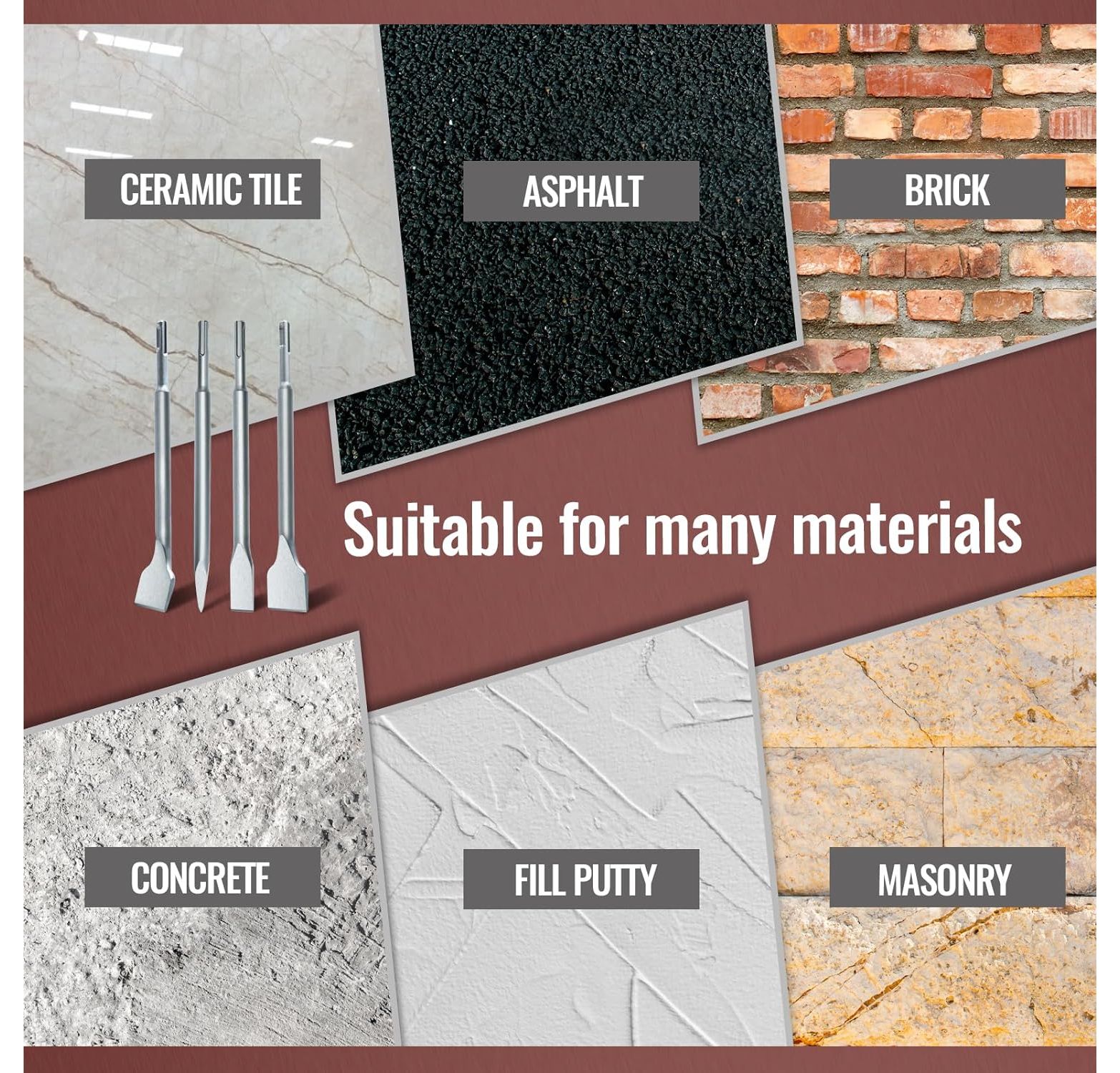 Unser Meißel ist äußerst vielseitig und perfekt geeignet für harte Materialien wie Fliesen, Ziegel, Stein, Beton und verschiedene Bau- und Mauerwerkstoffe. Er ist die optimale Wahl für Handwerker und Profis, die präzise Ergebnisse und Zuverlässigkeit benötigen.