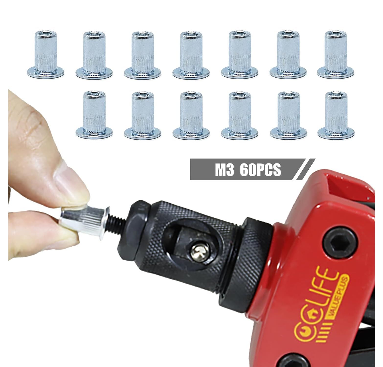 CCLIFE 60 Stück M3 Nietmuttern und Blindnietmuttern Set, 7mm x 9mm, verzinkter Kohlenstoffstahl - Ideale Befestigung für Stahl, Glasfaser und Kunststoff