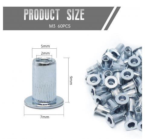 CCLIFE 60 Stück M3 Nietmuttern und Blindnietmuttern Set, 7mm x 9mm, verzinkter Kohlenstoffstahl - Ideale Befestigung für Stahl, Glasfaser und Kunststoff