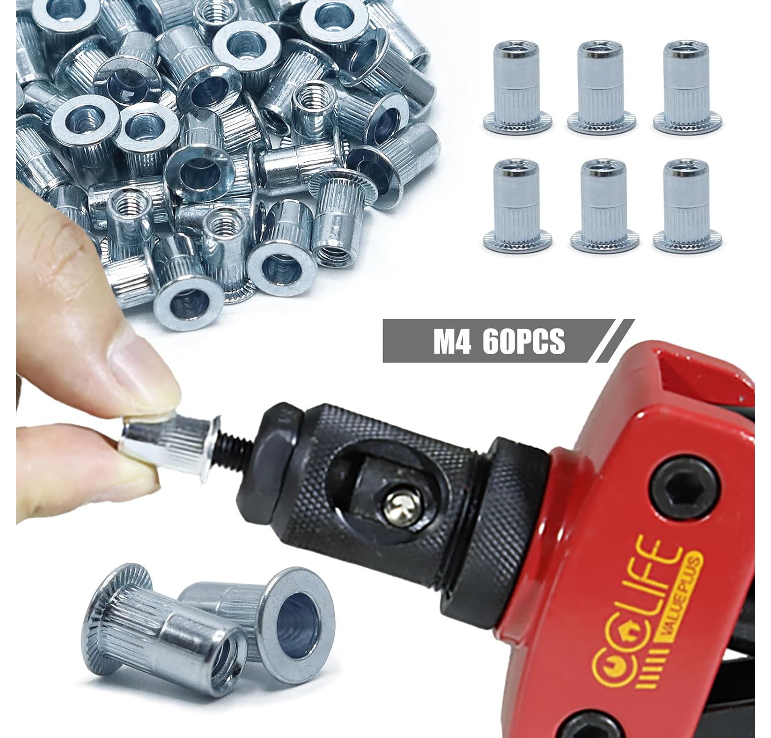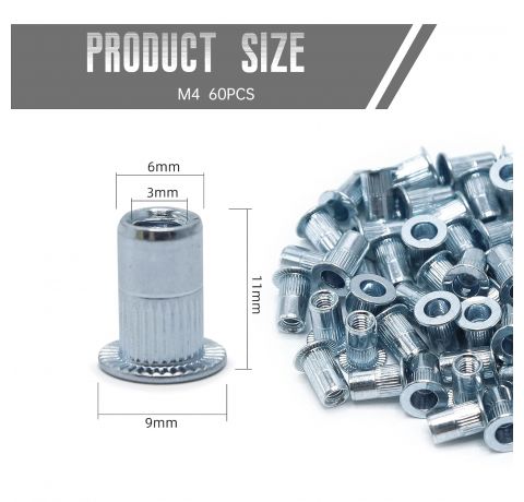 CCLIFE 60 Stück M4 Nietmuttern und Blindnietmuttern Set, 9mm x 11mm, verzinkter Kohlenstoffstahl - Ideale Befestigung für Stahl, Glasfaser und Kunststoff