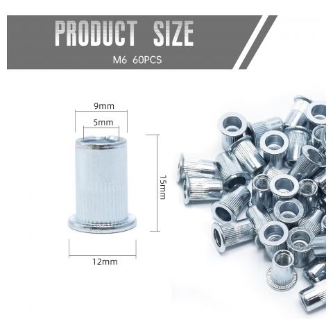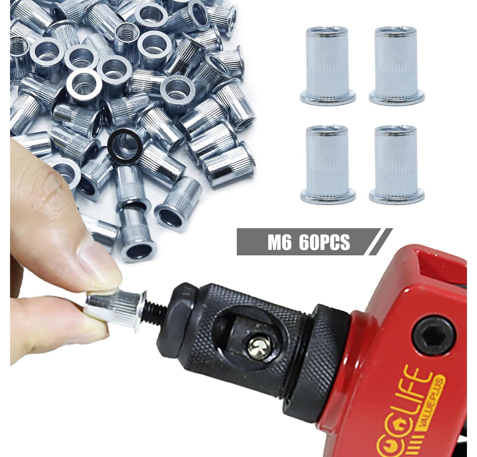 CCLIFE 60 Stück M6 Nietmuttern und Blindnietmuttern Set, 12mm x 15mm, verzinkter Kohlenstoffstahl - Ideale Befestigung für Stahl, Glasfaser und Kunststoff