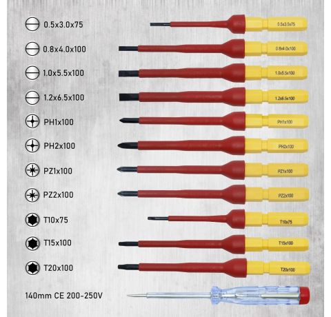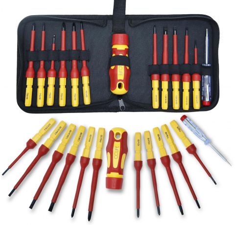 Isolierte VDE-Klingen für sicheres Arbeiten bis zu 1000 Volt. Alle Werkzeuge im Schraubendreher-Set sind VDE getestet. Der Schraubendreheraufsatz ist magnetisch, wodurch die Schraube effizienter eingeschraubt werden kann. Lange Suchen nach dem richtigen Schraubendreher gehören der Vergangenheit an, dank einer praktischen Markierung. Ein ergonomisches Design des Griffs und ein gummiertes Material ermöglichen ein einfaches und kraftvolles Arbeiten. Der abgeflachte Griff verhindert das Wegrollen der Schraubendreher. Die gummierte Oberfläche sorgt für einen guten Griff. Austauschbare VDE Klingen mit reduziertem Klingendurchmesser. In einem robusten Klappetui.