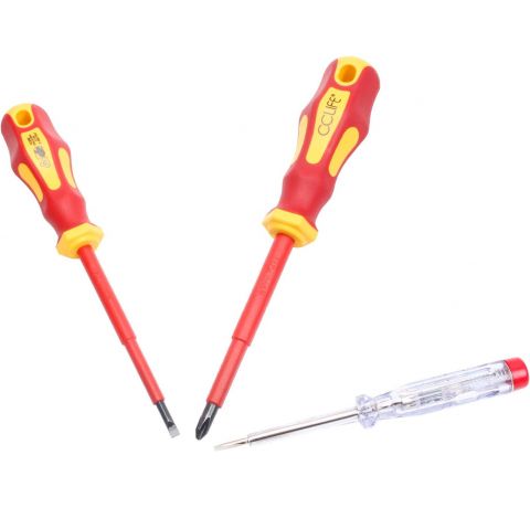 • SICHER - Deine Schlitz- und Kreuz-Schraubendreher haben einen gummierten Schaft bis 1000 V und der isolierte Phasenprüfer hilft dir, jede Art von Elektrik und Elektronik auf Spannung (200 - 250 V) zu prüfen