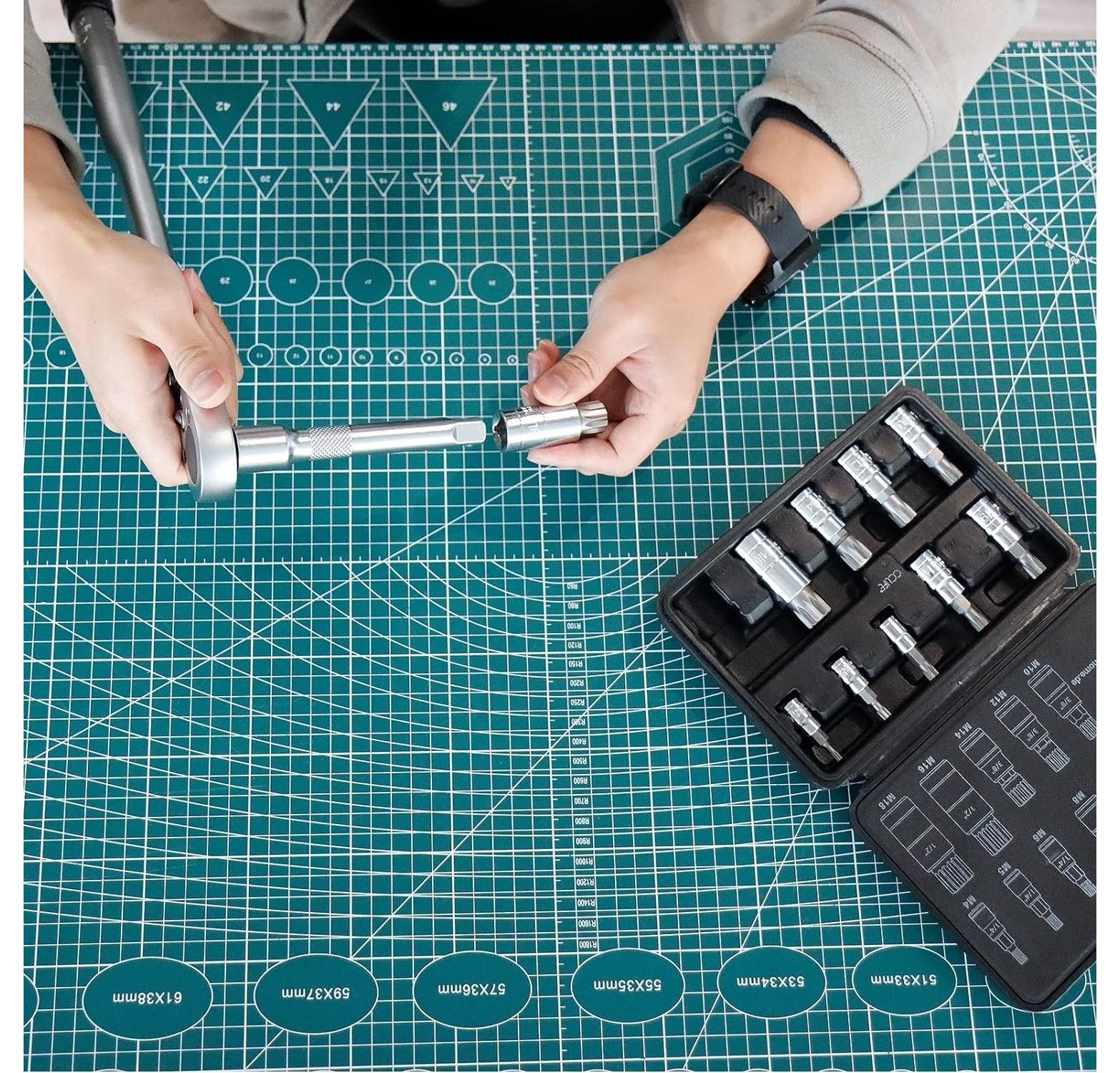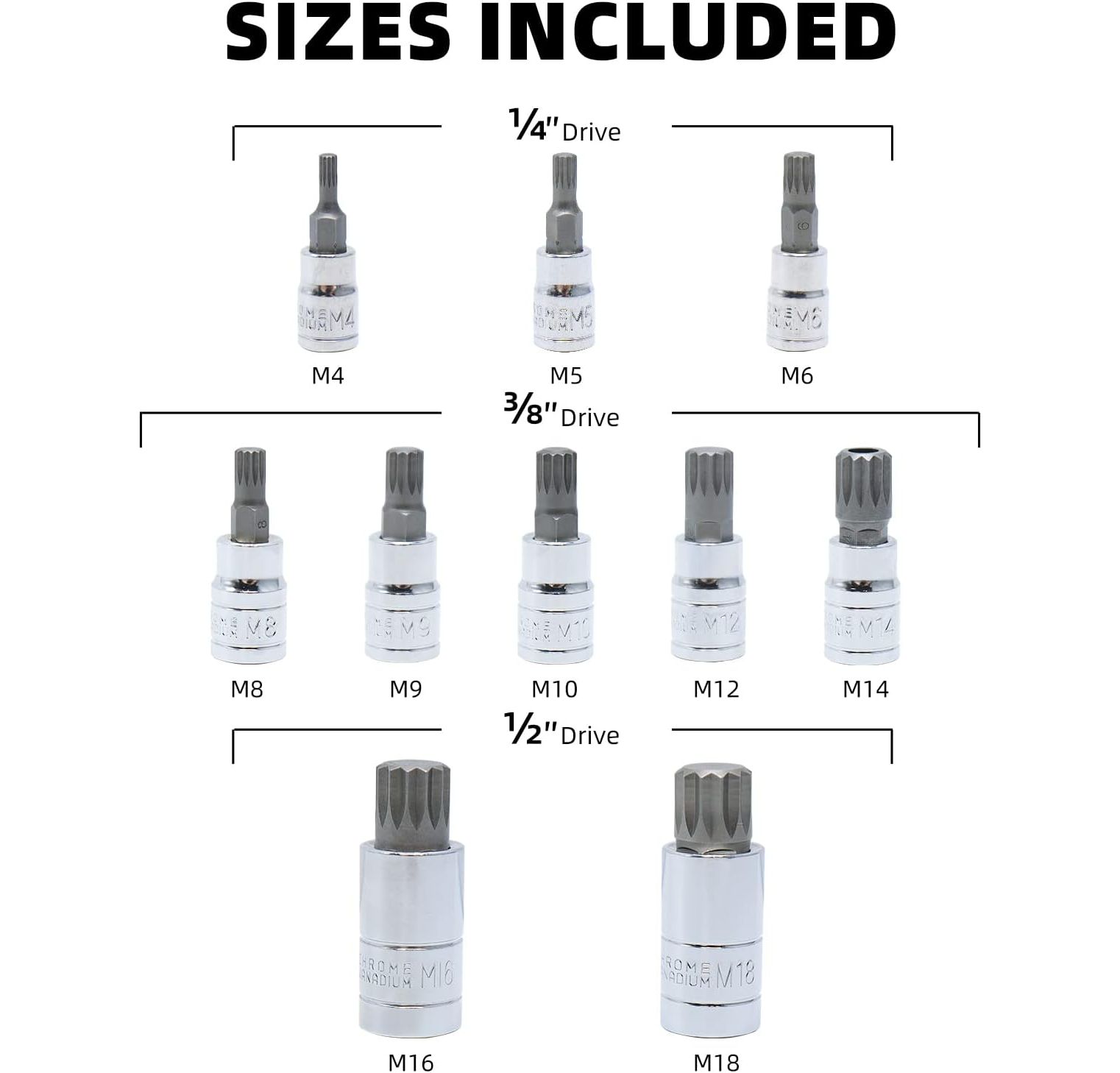 - 10tlg vielzahn nuss satz: 1/4''Größe : M4-M5-M6 ; 3/8"Größe : M8-M9-M10-M12-M14 ; 1/2"Größe : M16-M18