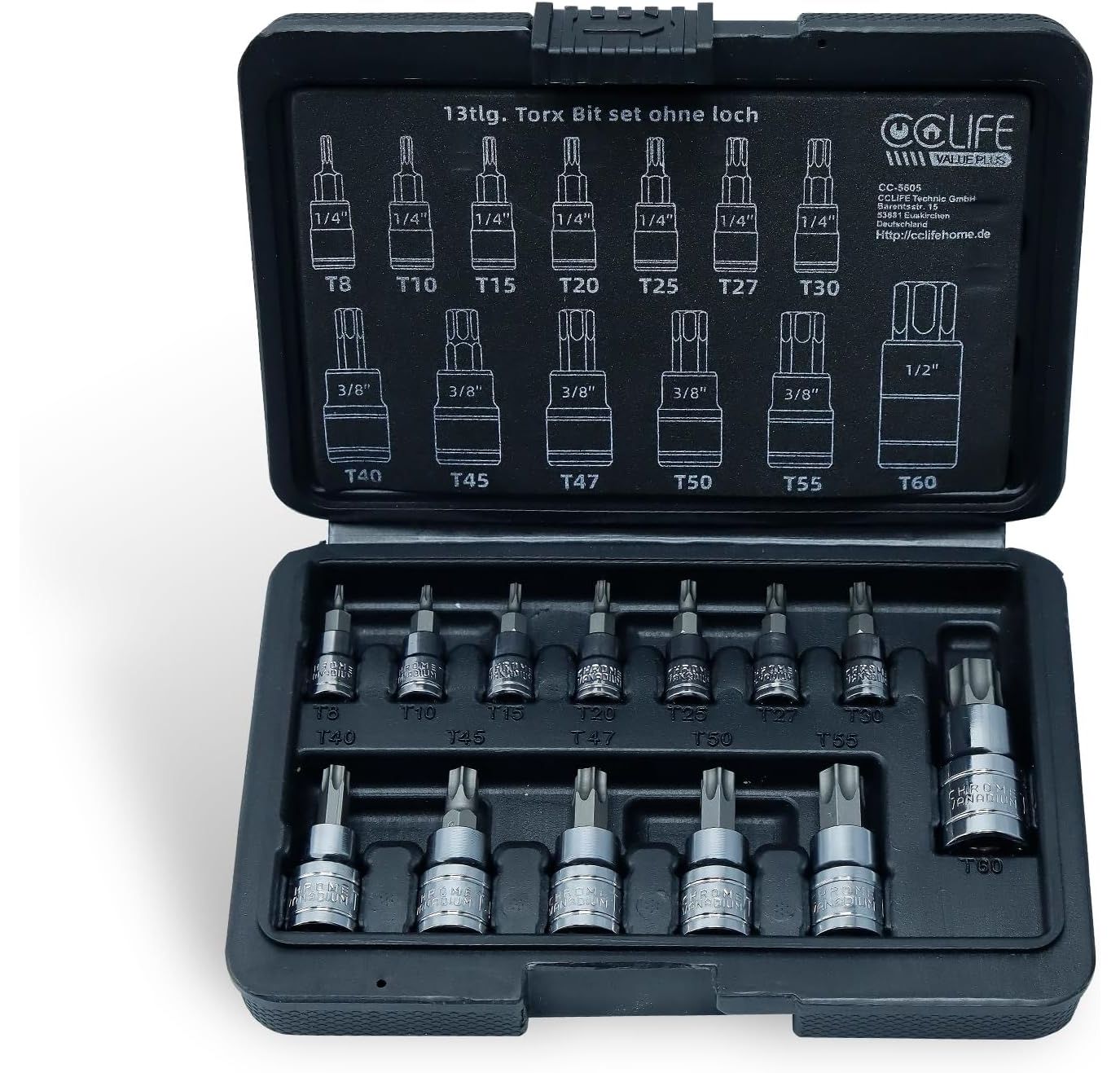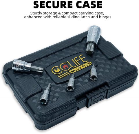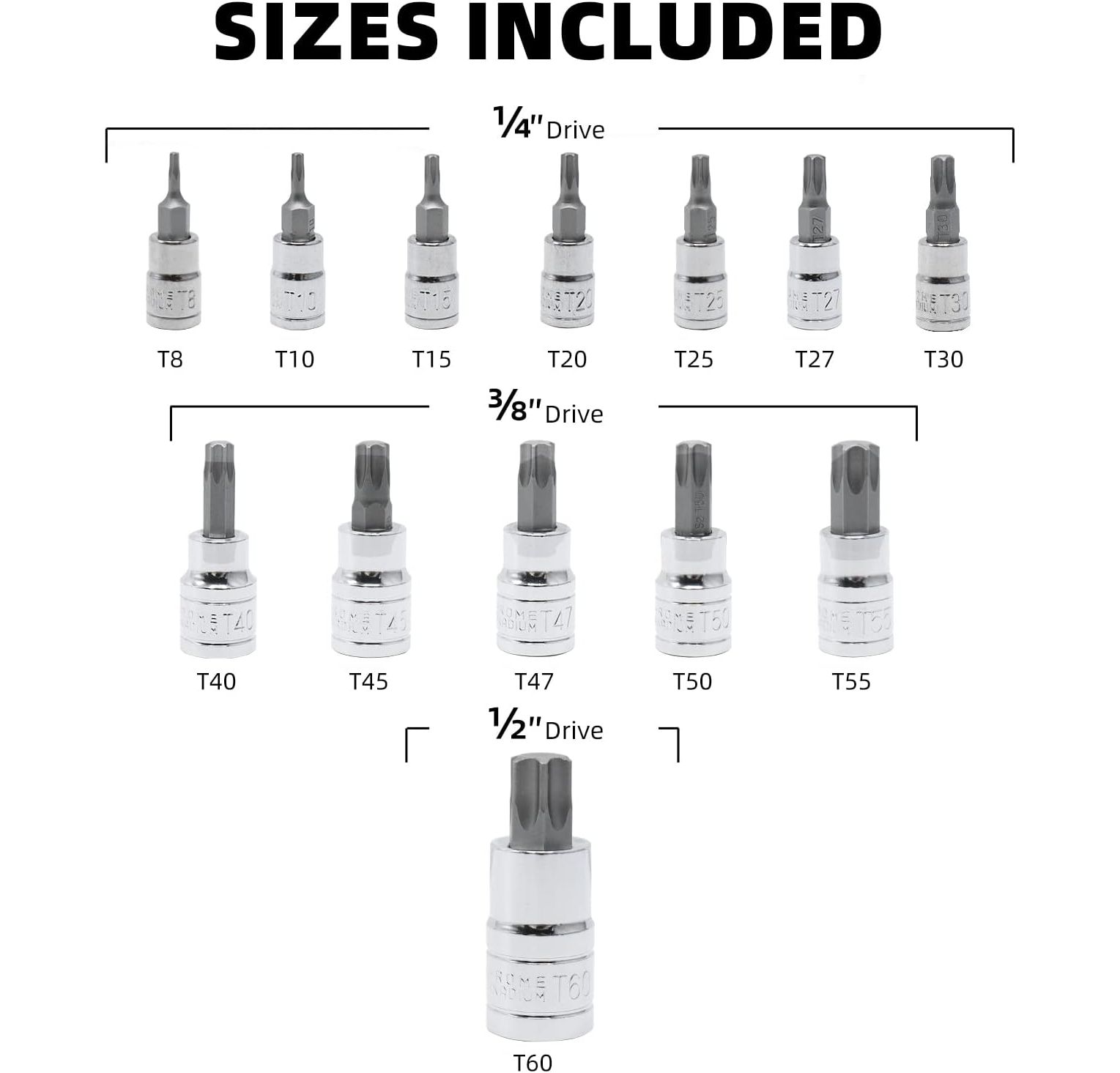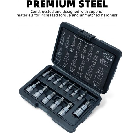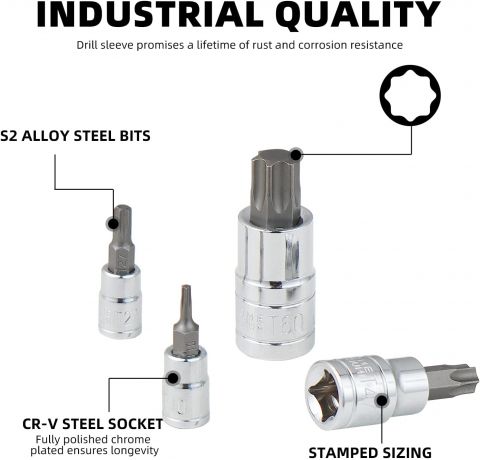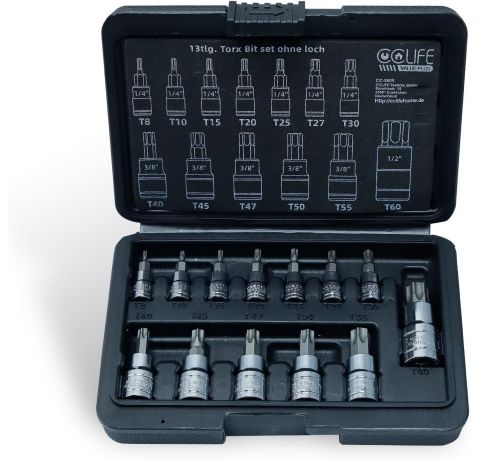 - 13tlg Torx: 1/4''Größe : T8-T10-T15-T20-T25-T27-T30; 3/8"Größe : T40-T45-T47-T50-T55; 1/2"Größe : T60