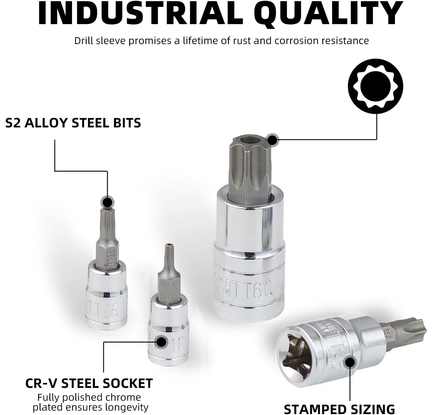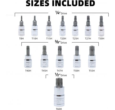 • 13tlg Torx: 1/4''Größe :T8H-T10H-T15H-T20H-T25H-T27H-T30H ; 3/8"Größe :T40H-T45H-T47H-T50H-T55H ; 1/2"Größe :T60H