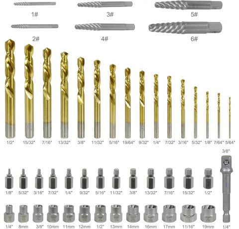 - 13 Stücke Cr-Mo Ausdreh-Bits: 1/8”, 5/32”, 3/16”, 7/32”, 1/4”, 9/32”, 5/16”, 11/32”, 3/8”, 13/32”, 7/16”, 15/32”, 1/2”