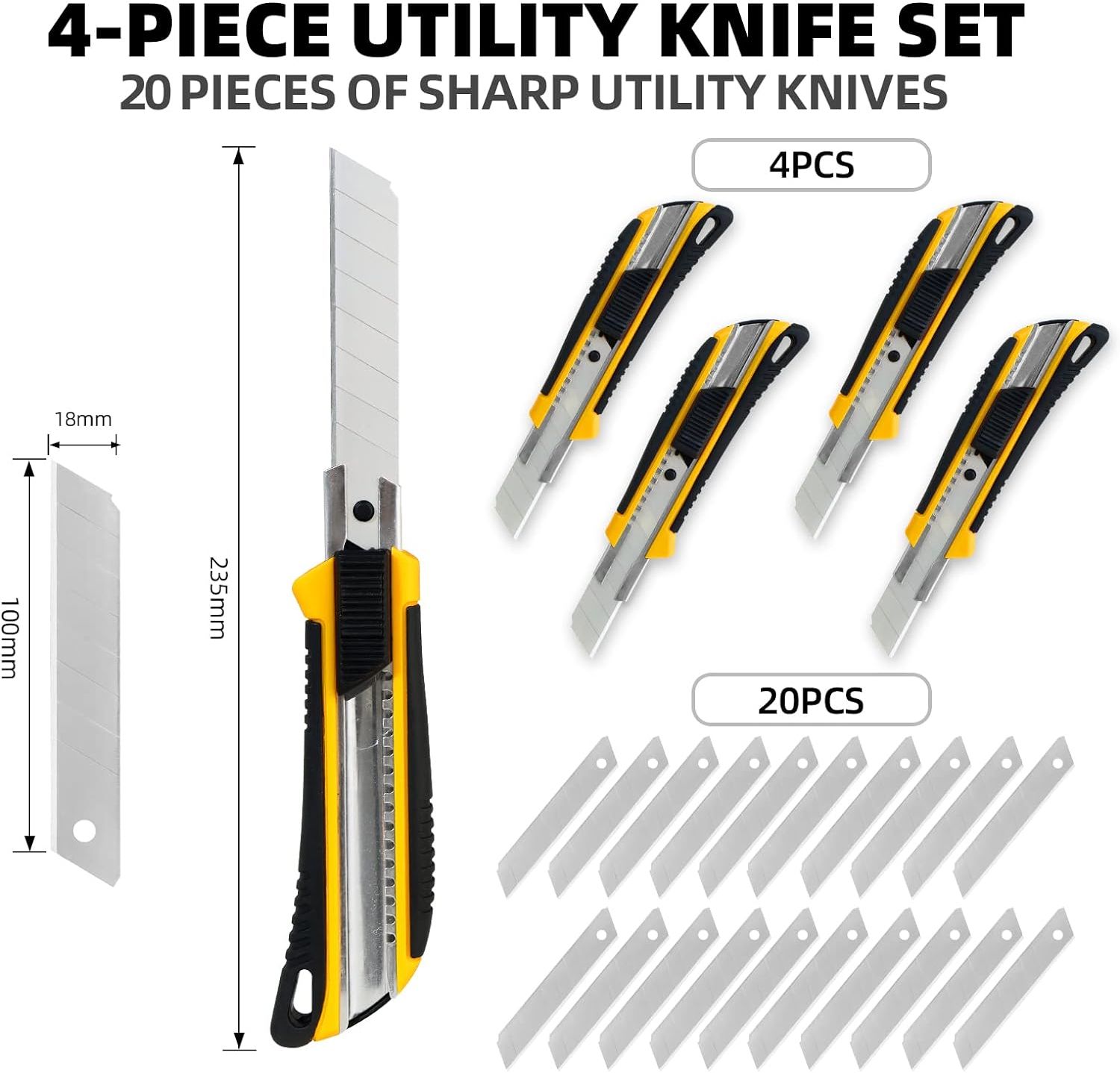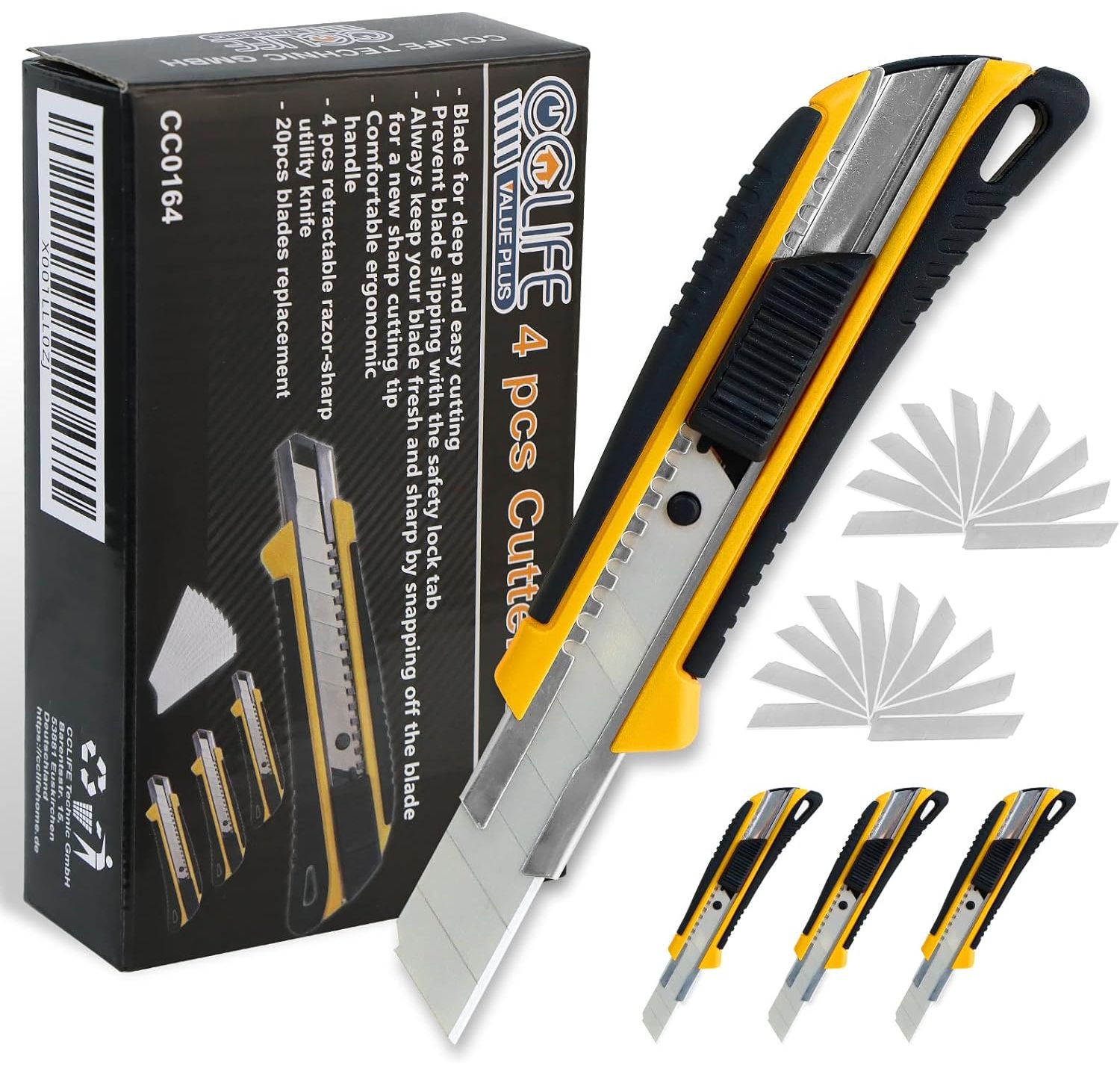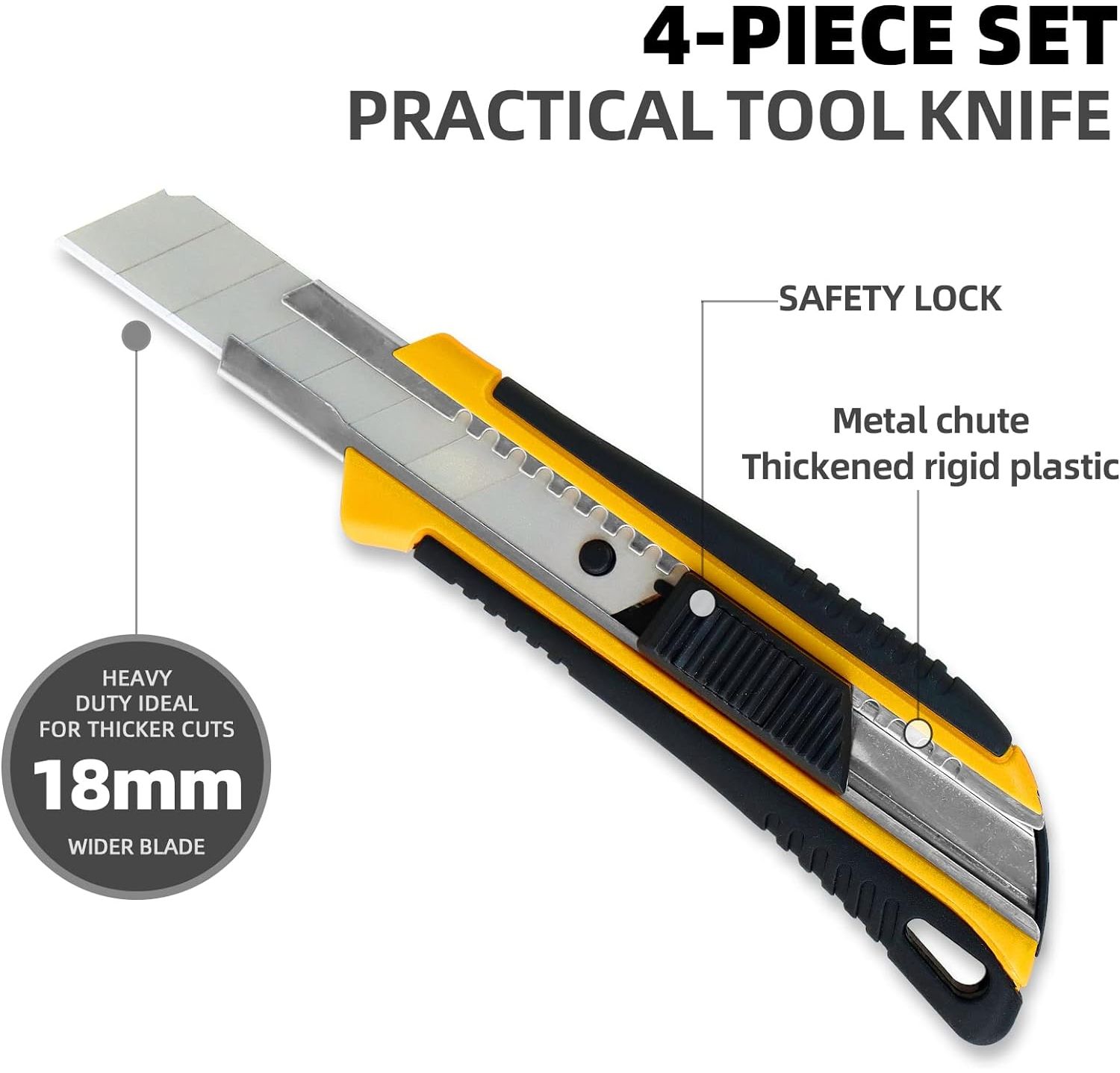 CCLIFE 4 Stück Cuttermesser 18mm Abbrechklinge Kartonmesser Mehrzweck Messer Allzweckmesser Teppichmesser mit Sicherheitslock inkl. 20 Ersatzklingen