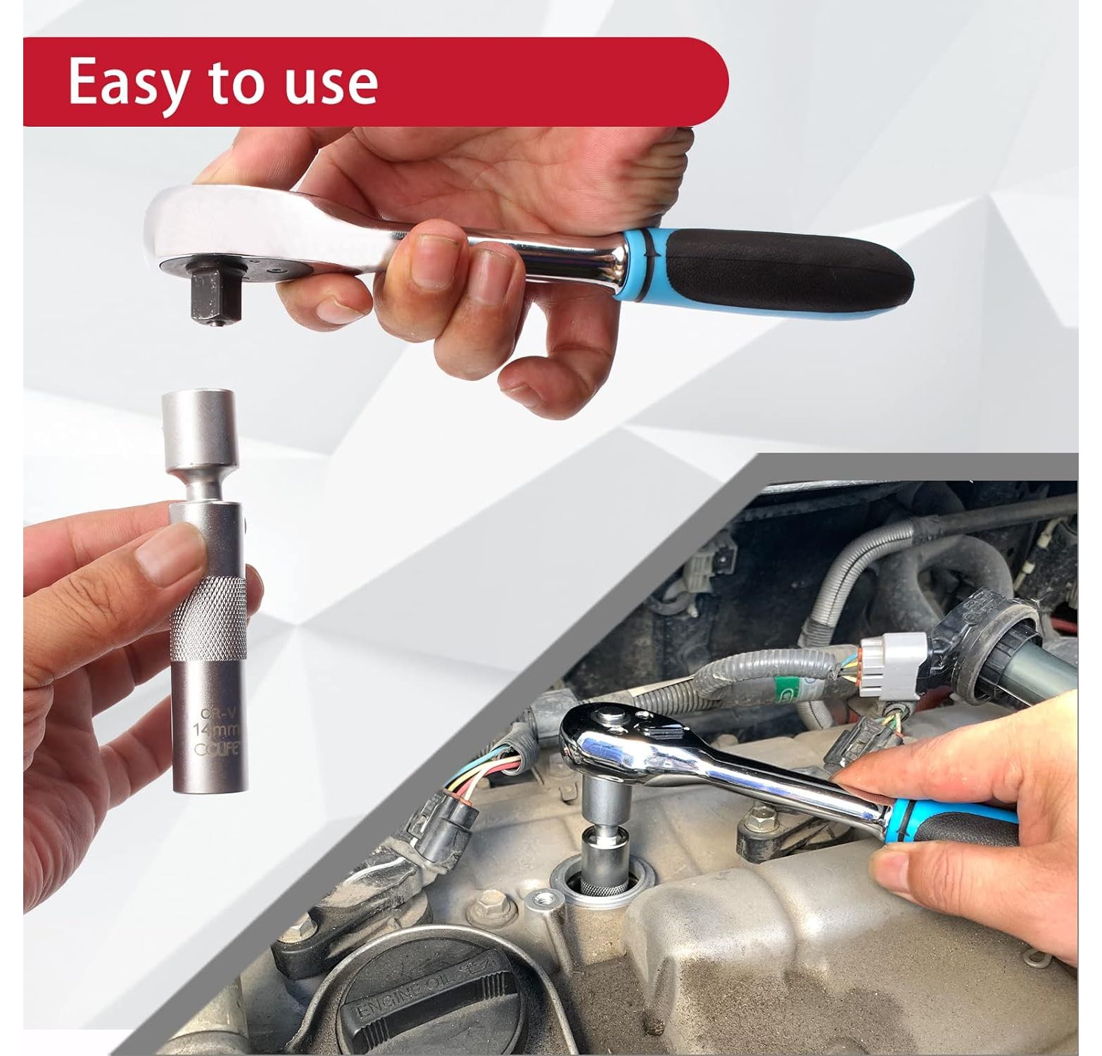 - Special ball joint design for easy installation and removal of deep-seated or with interference edges, hard-to-reach ignition and glow plugs.