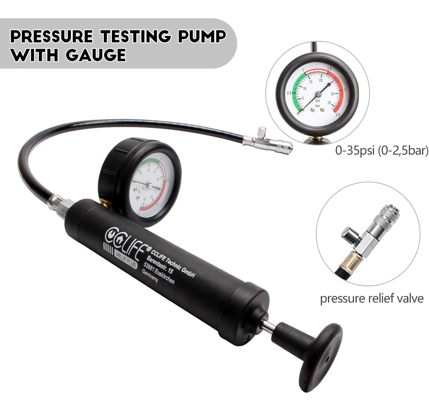 - Guaranteed test: Hand pressure pump with colour-coded 0-35 PSI (0-2.5 bar) pressure gauge ensures a safe, correct, simple and clear test.