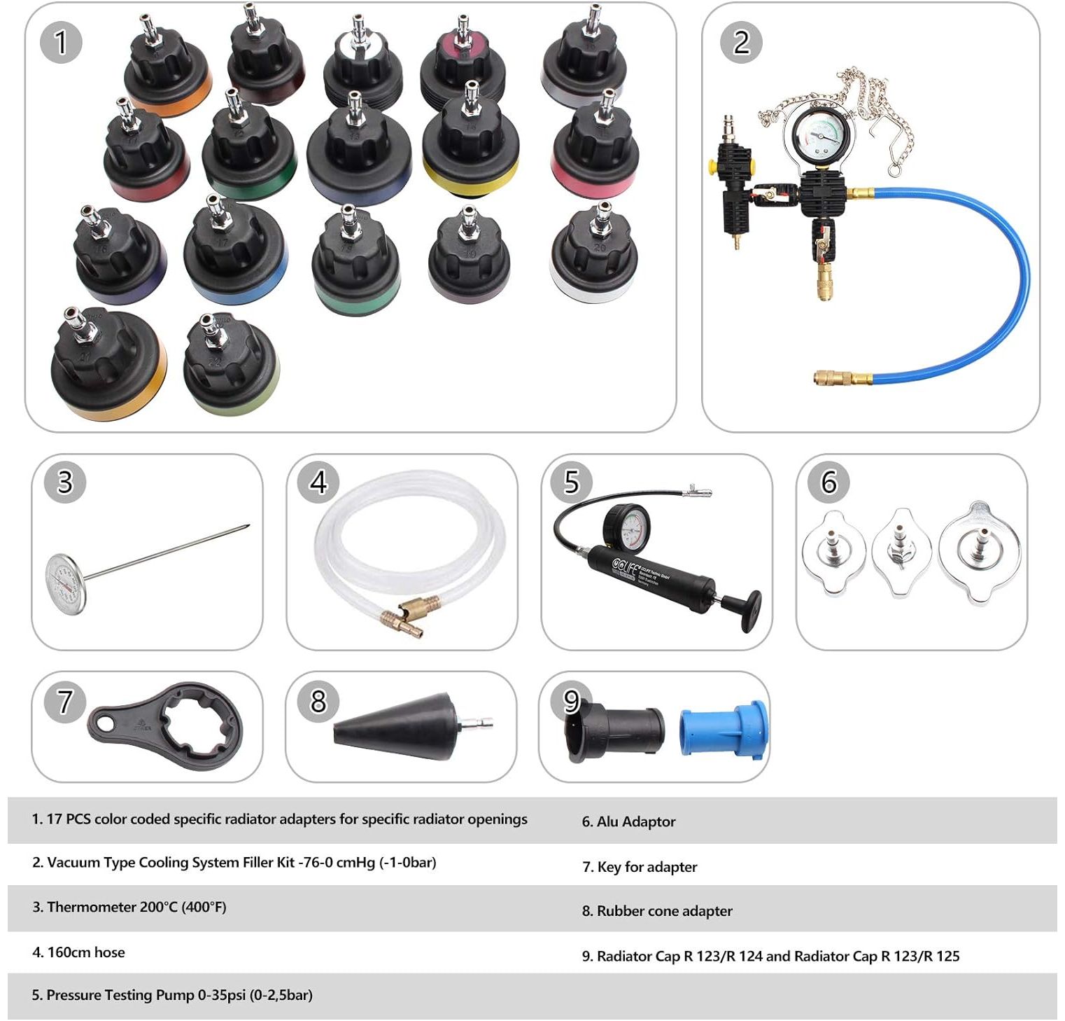 - Use: The device is suitable for checking and filling cooling systems of all common vehicle types. Europe, Japan, USA, etc.