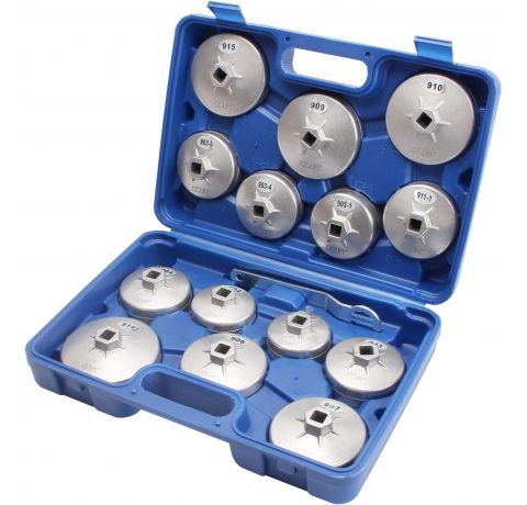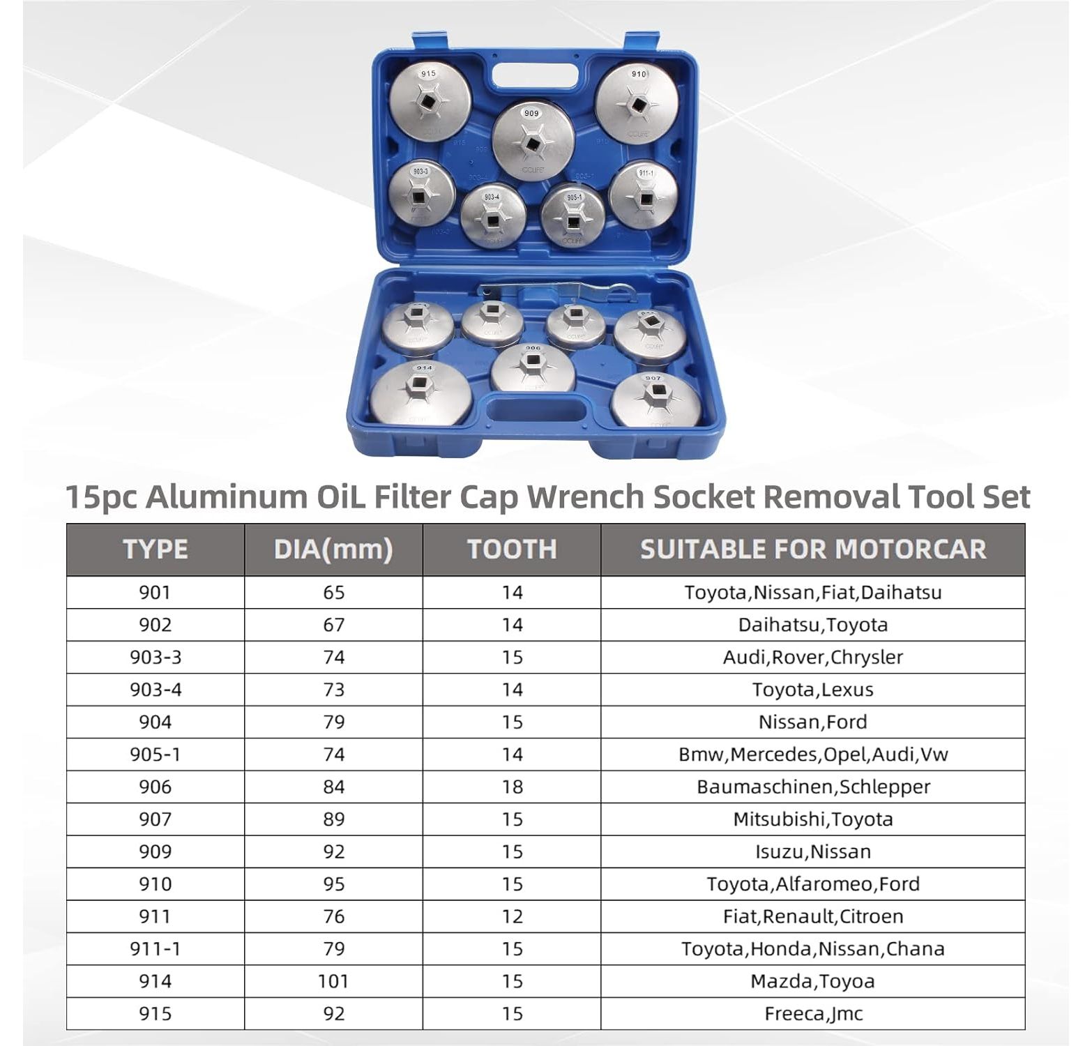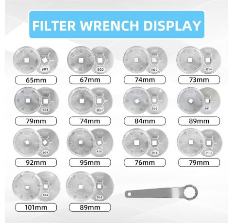 - 14 oil filter caps in different sizes: 901 (65 mm), 902 (67 mm), 903-3 (74 mm), 903-4 (73 mm), 904 (79 mm), 905-1 (74 mm), 906 (84 mm), 907 (89 mm), 909 (92 mm), 910 (95 mm). ),911(76mm),911-1(79mm),914(101mm),915(92mm). 1 x ring spanner.