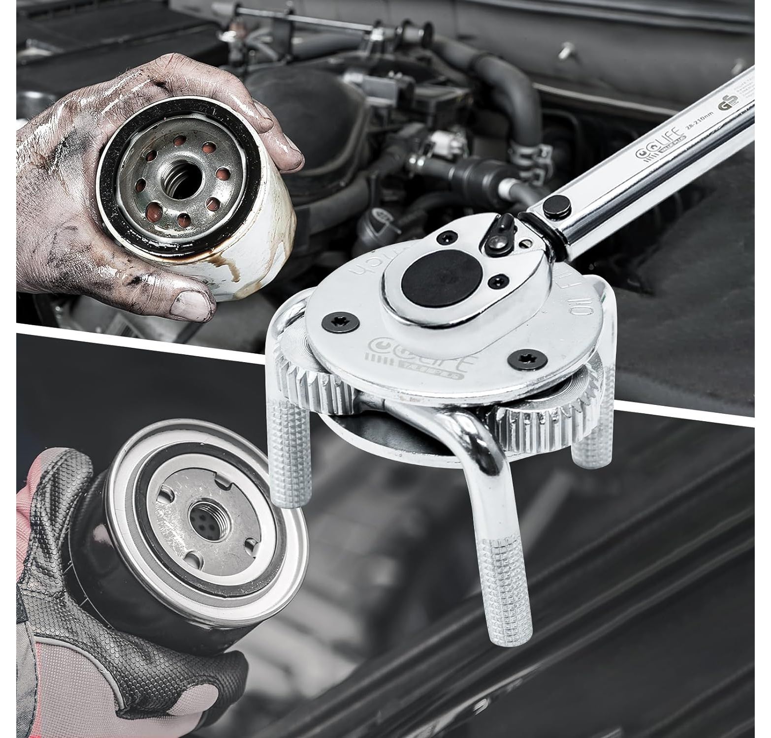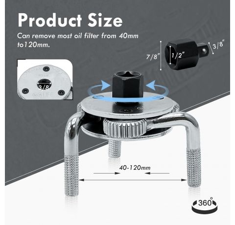 - The adjustable oil filter wrench allows you to remove or tighten oil filters with a diameter of 40 to 120 mm.