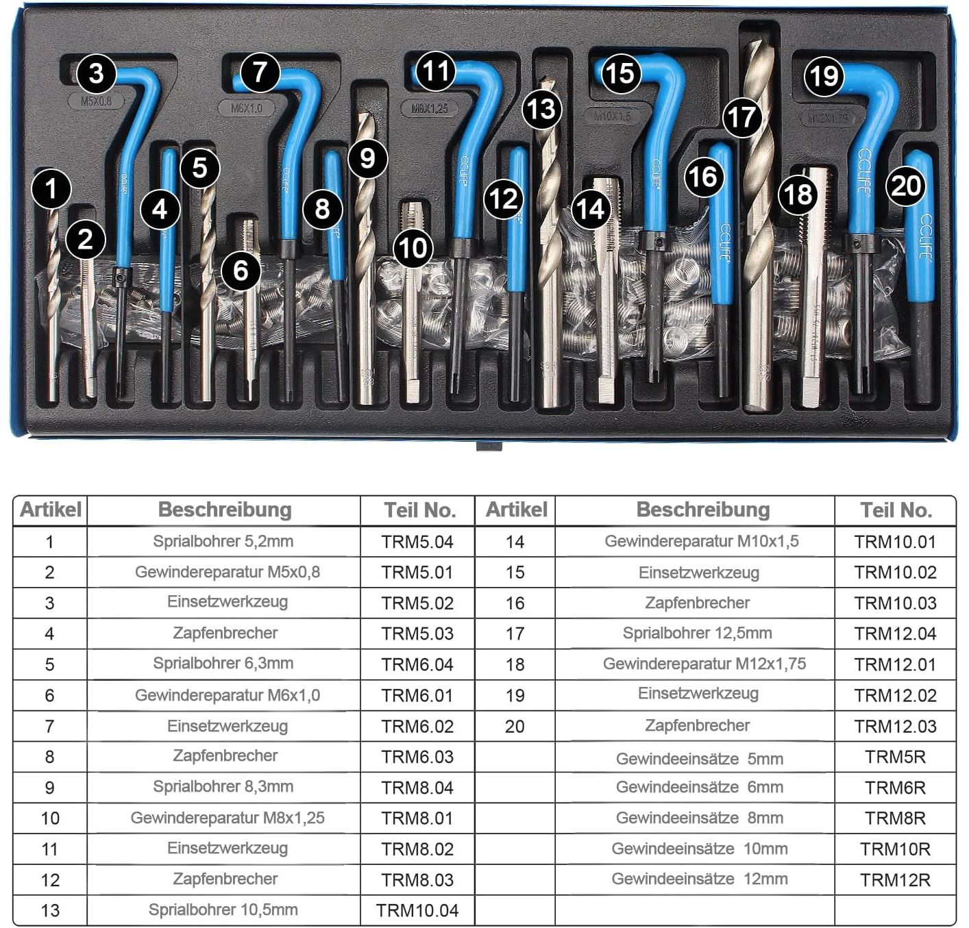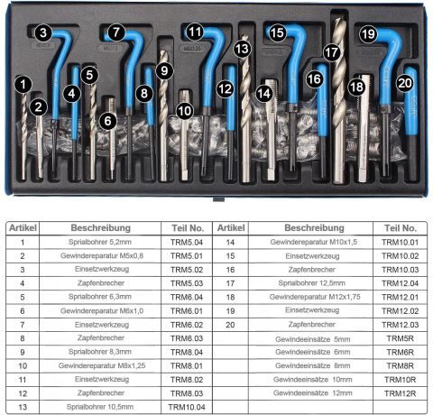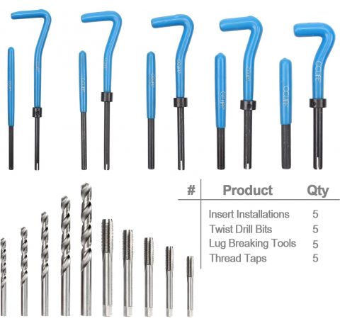 - Box contents: 5 twist drills for drilling the defective threads; 5 taps; 5 insertion tools for mounting the repair inserts; 5 tenon breaker for removing the screw-in pins.