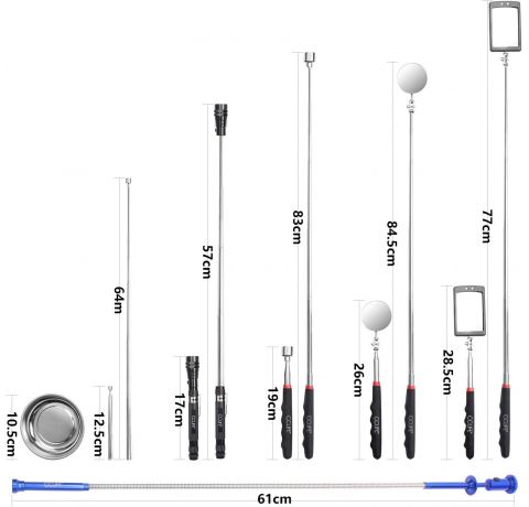 - 7-piece fully functional pick up tool set includes: two extendable magnetic lifters with magnetic force 15 lb and 1.5 lb, a square inspection mirror with 2 LEDs, a round inspection mirror, a torch with 3 LEDs, a magnetic lifter and claw gripper 2 in 1 combination tool, a magnetic bowl