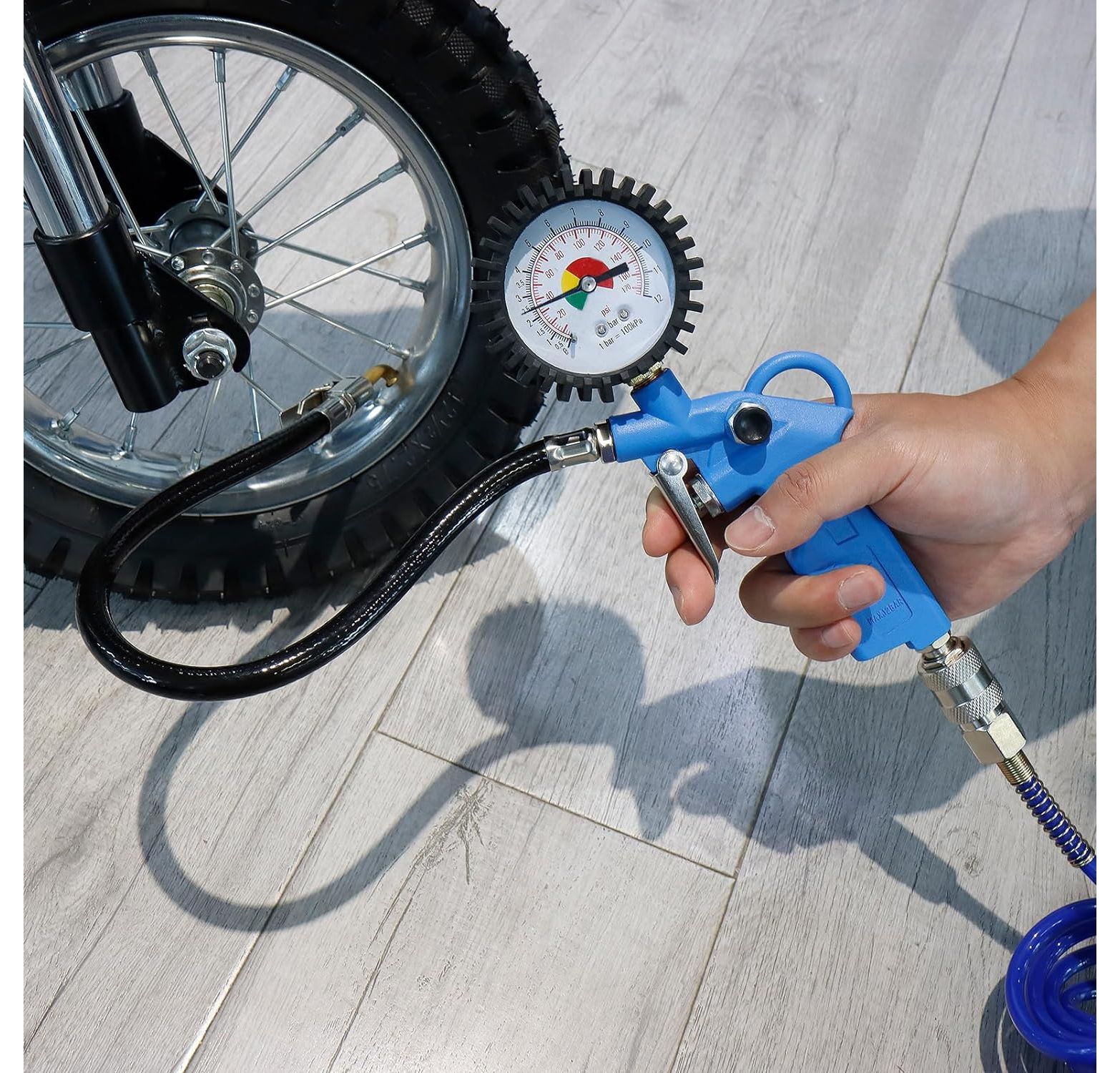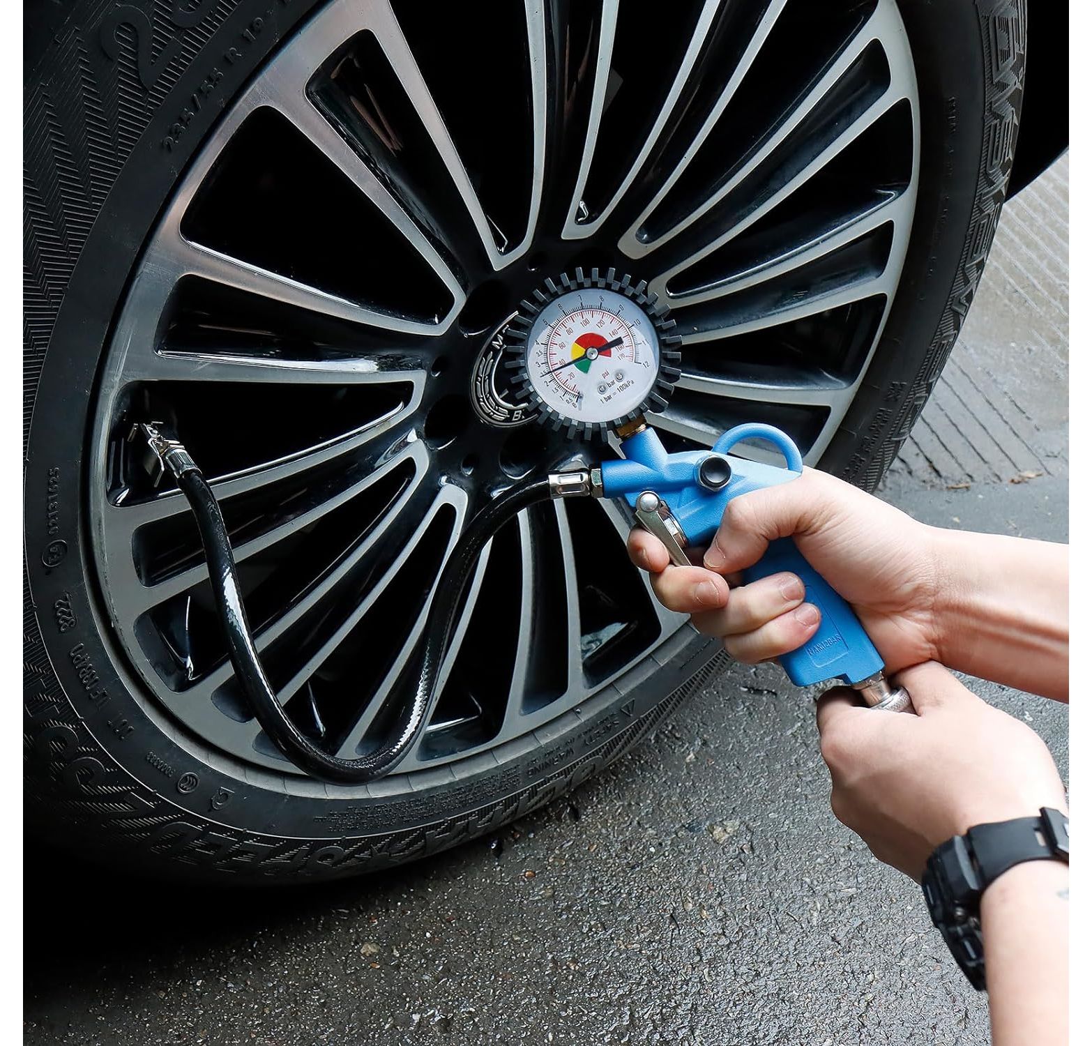 CCLIFE Tyre pressure gauge tyre inflator 3-in-1 tyre pressure gauge tyre inflator with valve core tool, 12 bar 170 PSI for car, bicycle, truck, motorcycle. Accurate pressure readings: with the professionally calibrated pressure gauge, you can accurately measure the tyre pressure. Versatile Compatibility The all-in-one design of the tire pressure gauge allows the function to deflate, inflate and check the tire pressure. Easy to Use The 1/4" hose lock on the air chuck and quick coupling make it easy to attach the inflator to air compressor and tire. HIGH PRESSURE CAPACITY With a maximum pressure of 12 bar, this tyre inflator is perfect for a variety of vehicles. Increased safety: properly inflated tires provide better performance in all weather conditions, reduce the likelihood of punctures and prevent tire wear to drive safer.