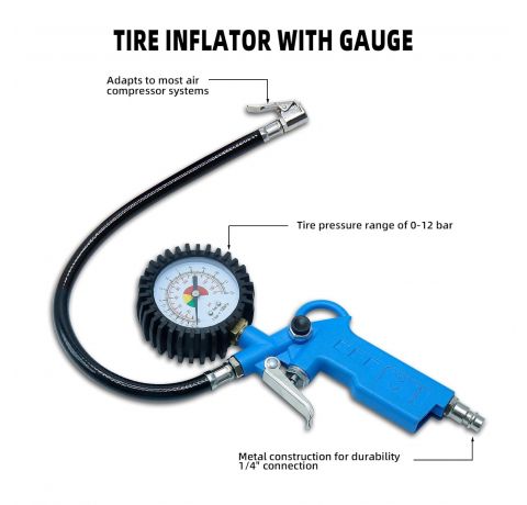 - Versatile Compatibility The all-in-one design of the tire pressure gauge allows the function to deflate, inflate and check the tire pressure.