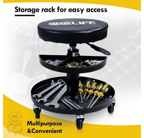 • Workshop stool height adjustable. The 360° rotating blade is ideal for storing small tools, spare parts and maintenance equipment