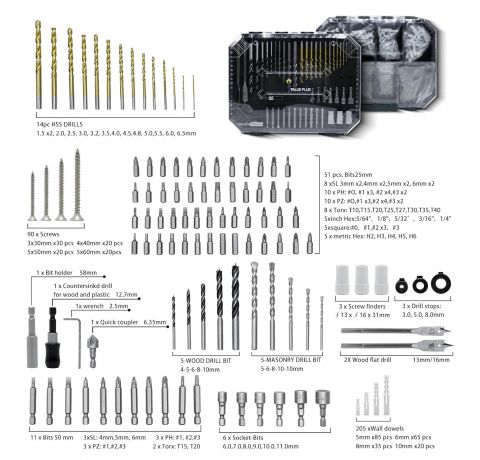 - FULLY EQUIPPED The 400 piece drill and screw set includes 14 HSS drill bits, 5 wood twist drill bits, 5 masonry drill bits, 2 flat milling drill bits for wood, 51 25mm drill bits, 11 50mm drill bits, 6 socket drills, 1 wrench, 1 quick coupling, 3 drill bits, 1 countersink for wood and plastic, 1 drill bit erererholholholholDetectors, 90 screws, 205 wall dowels, 1 box