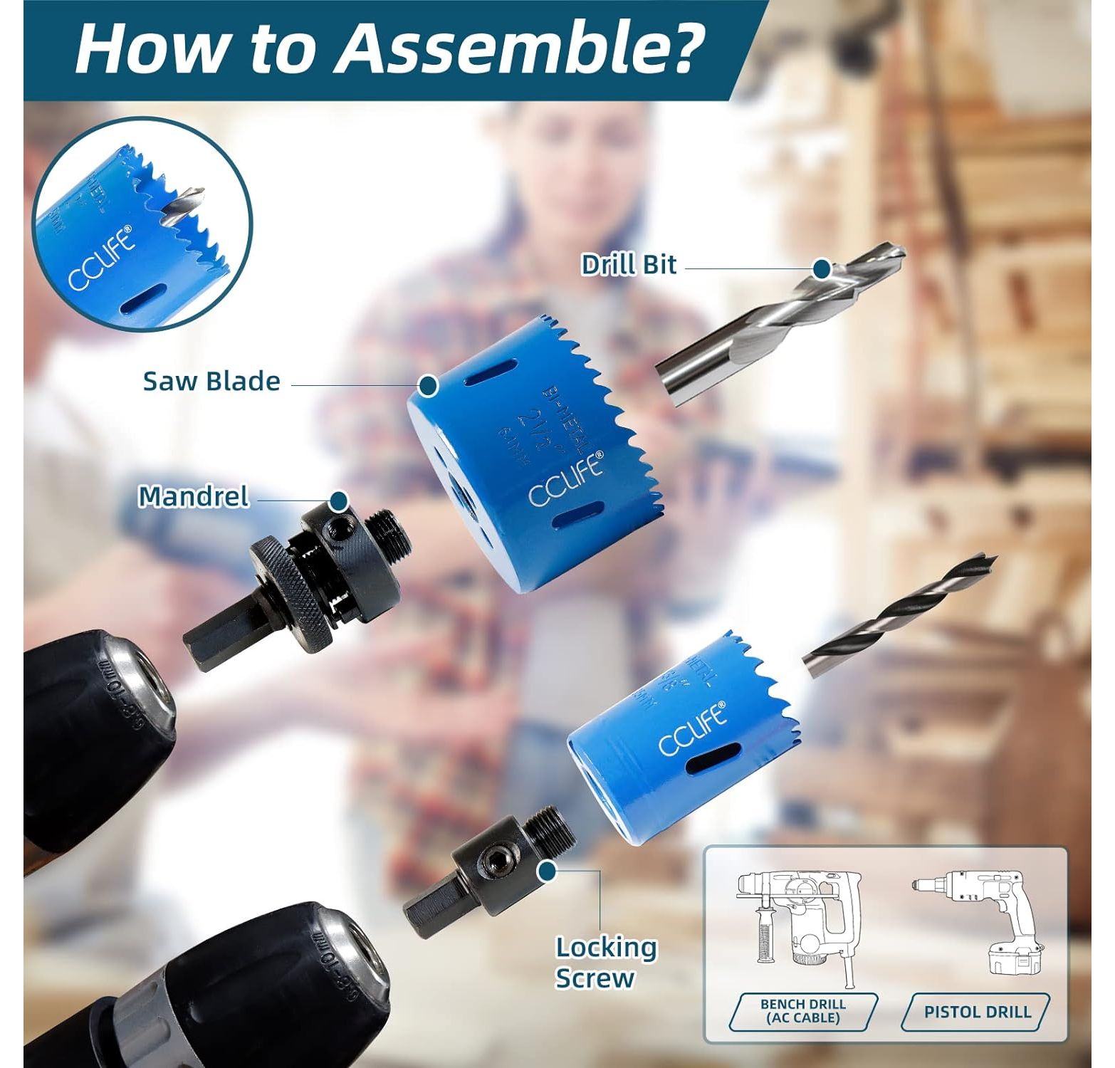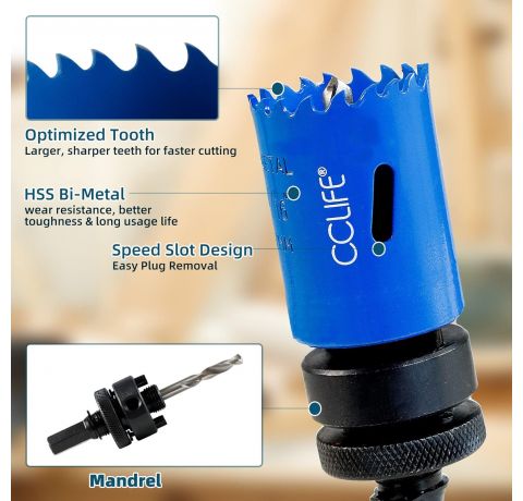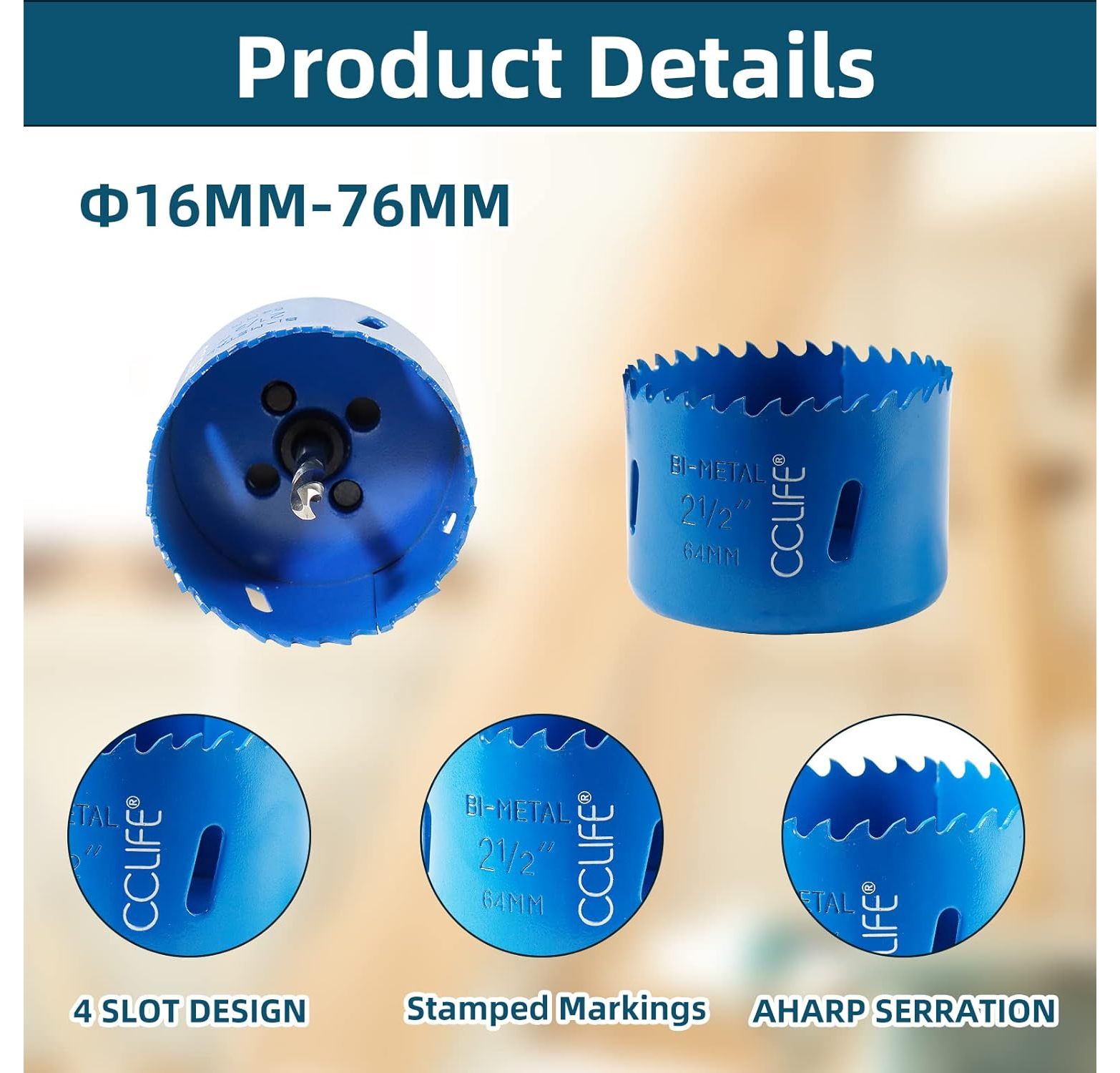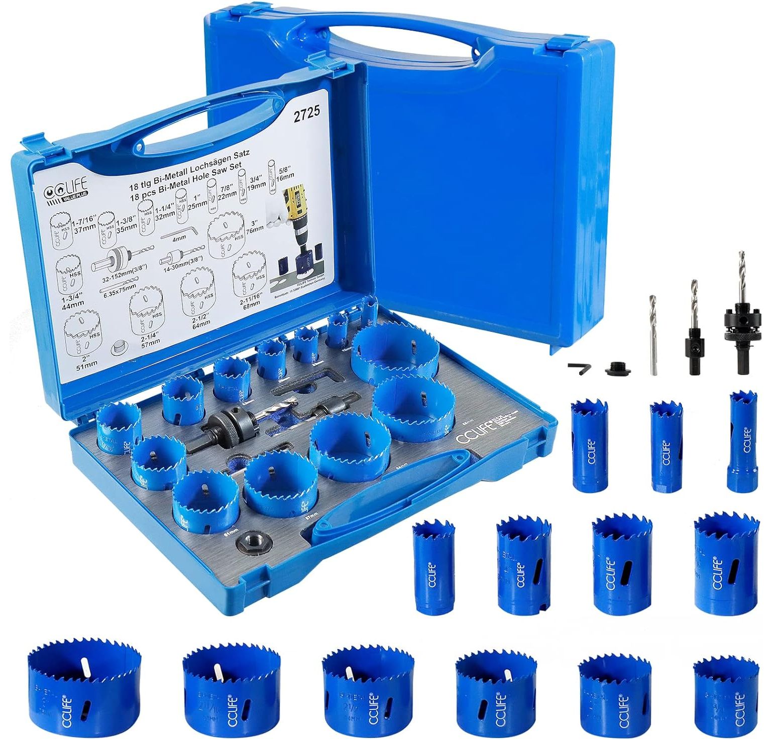 CCLIFE Bi-Metal Hole Saw Set, 18-Piece Bi-Metal M3 HSS-CO Hole Drill Bit Diameter 16-76 mm, Cutting Depth 38 mm, for Drilling Stainless Steel, Light Metal, Wood, PVC, Plastic, etc