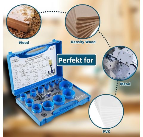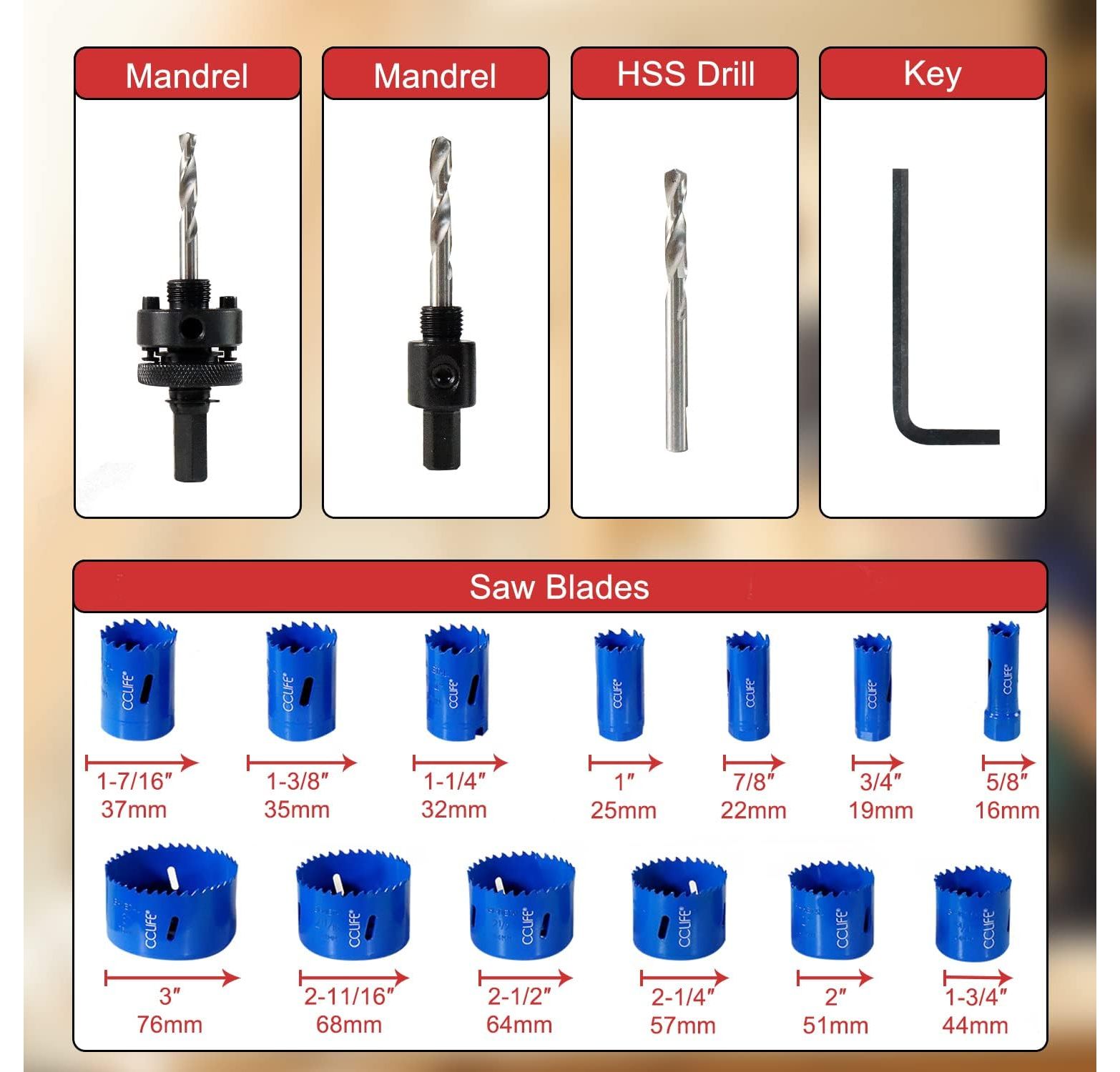 - Box contents: 13 x hole saws with diameter: 16-19-22-25-32-35-37-44-51-57-64-68-76 mm, 2 x name shafts with 11 mm (7/16 inch) and 9.5 mm drive (3/8 inch), 1 x adapter. Cutting depth: 38 mm