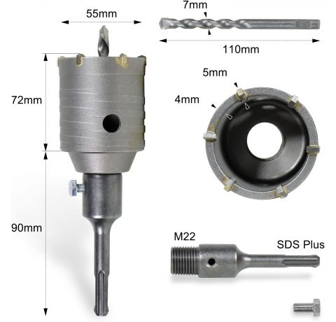 - VARIOUS SIZES Concrete hole saw diameter 50mm, 55mm, 65mm, 67.5mm, 80mm, 82mm, 100mm. Pilot drill length 160mm 350mm