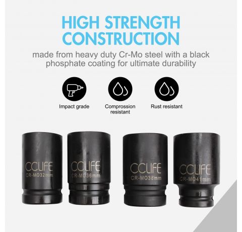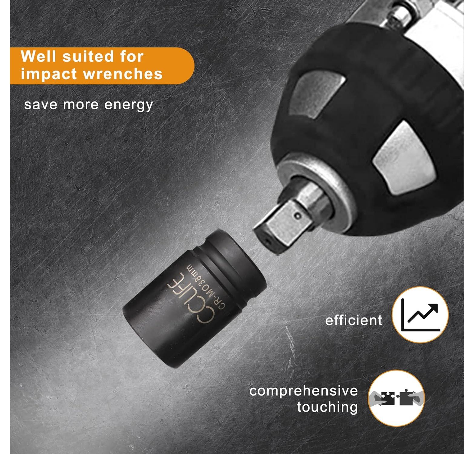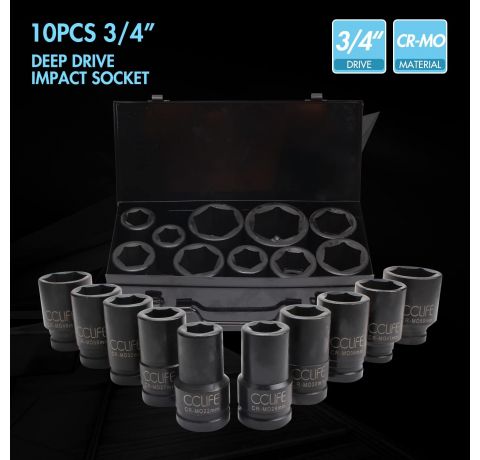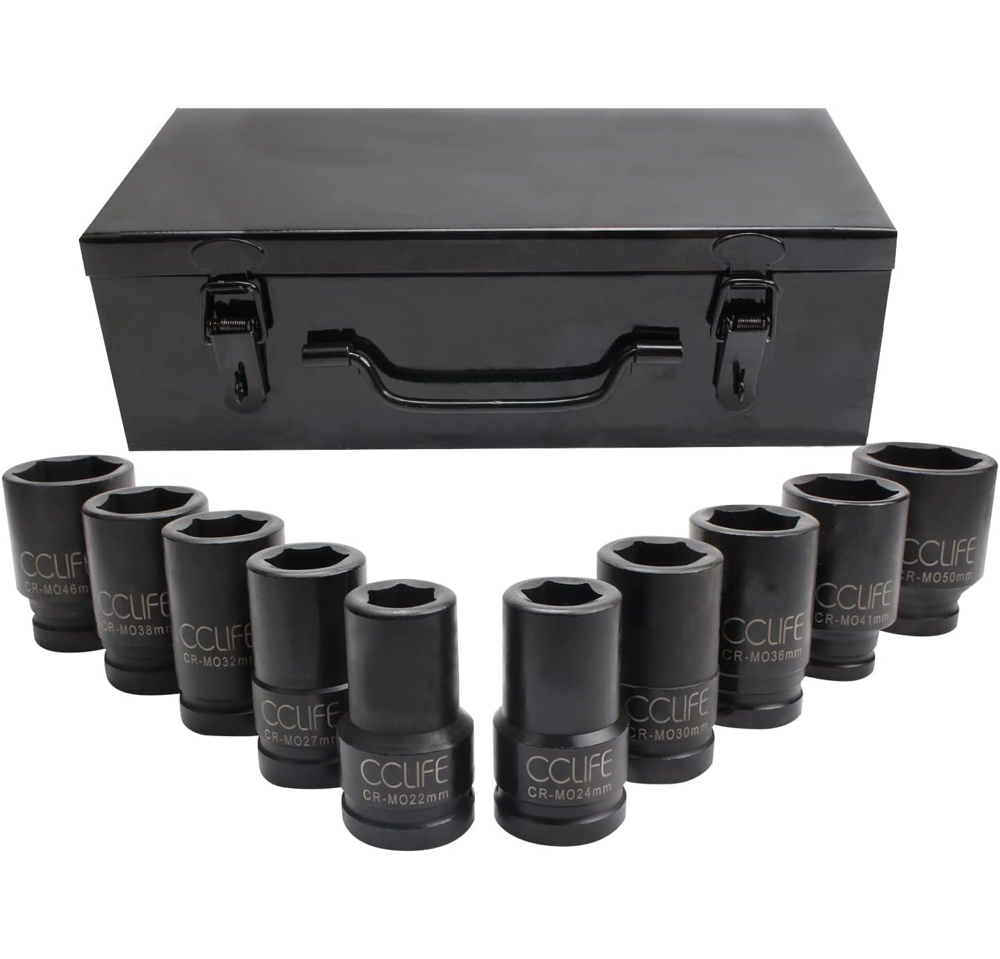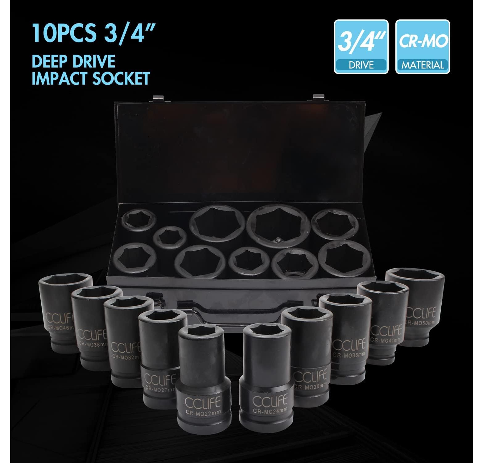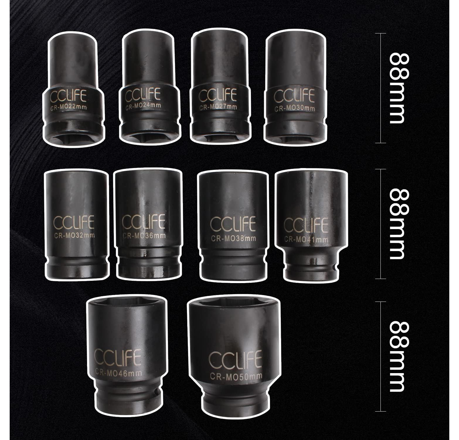CCLIFE 10-Piece 3/4 Inch Power Impact Wrench Nuts Hexagonal Nut Impact Socket 22-50 mm Long Socket Set Socket Set