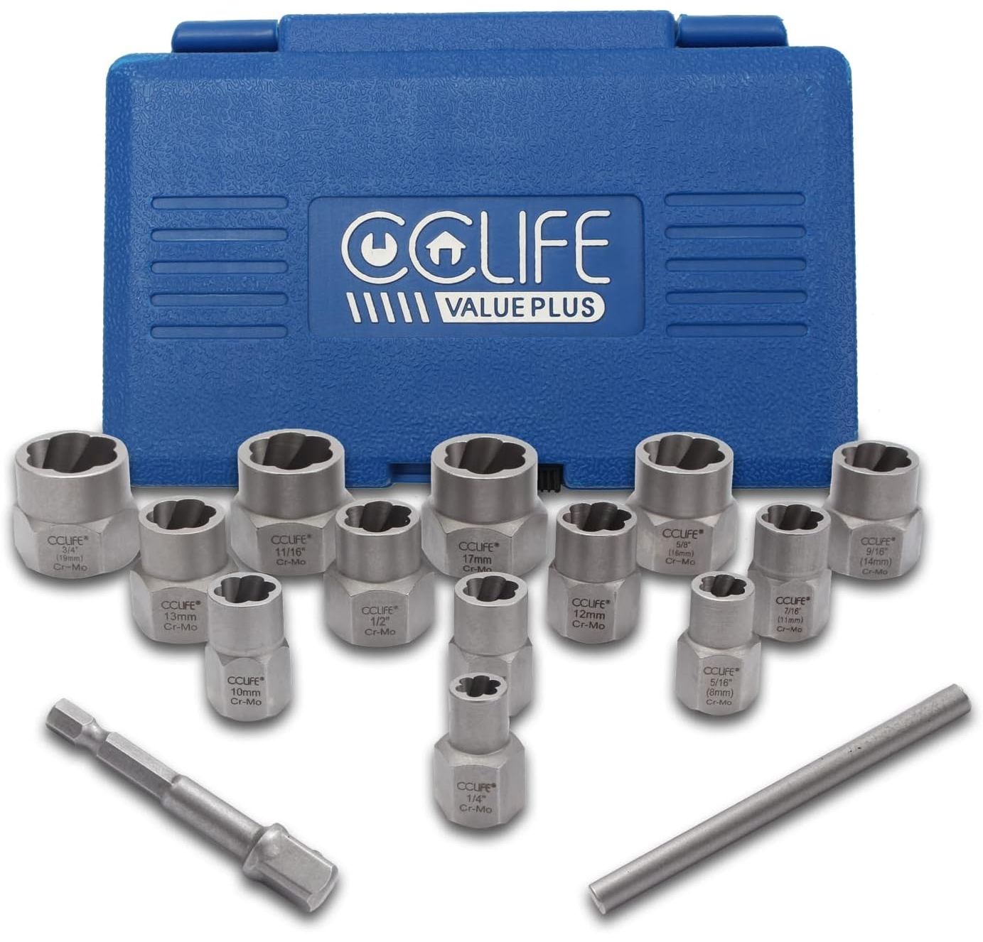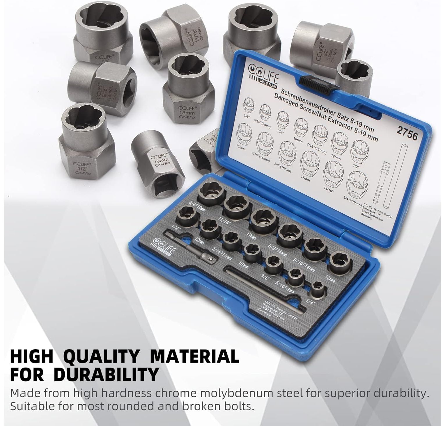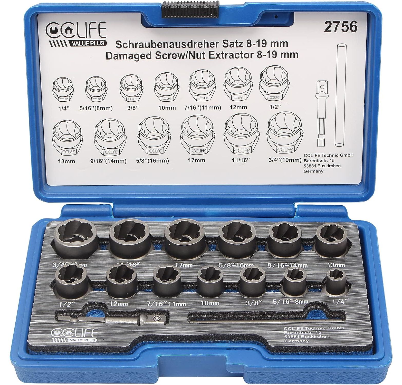 CCLIFE 15-Piece 3/8 Inch Cr-Mo Special Socket Wrench Insert Left Extractor Screw Extractor Nut Remover 8-19 mm Turbo Nuts