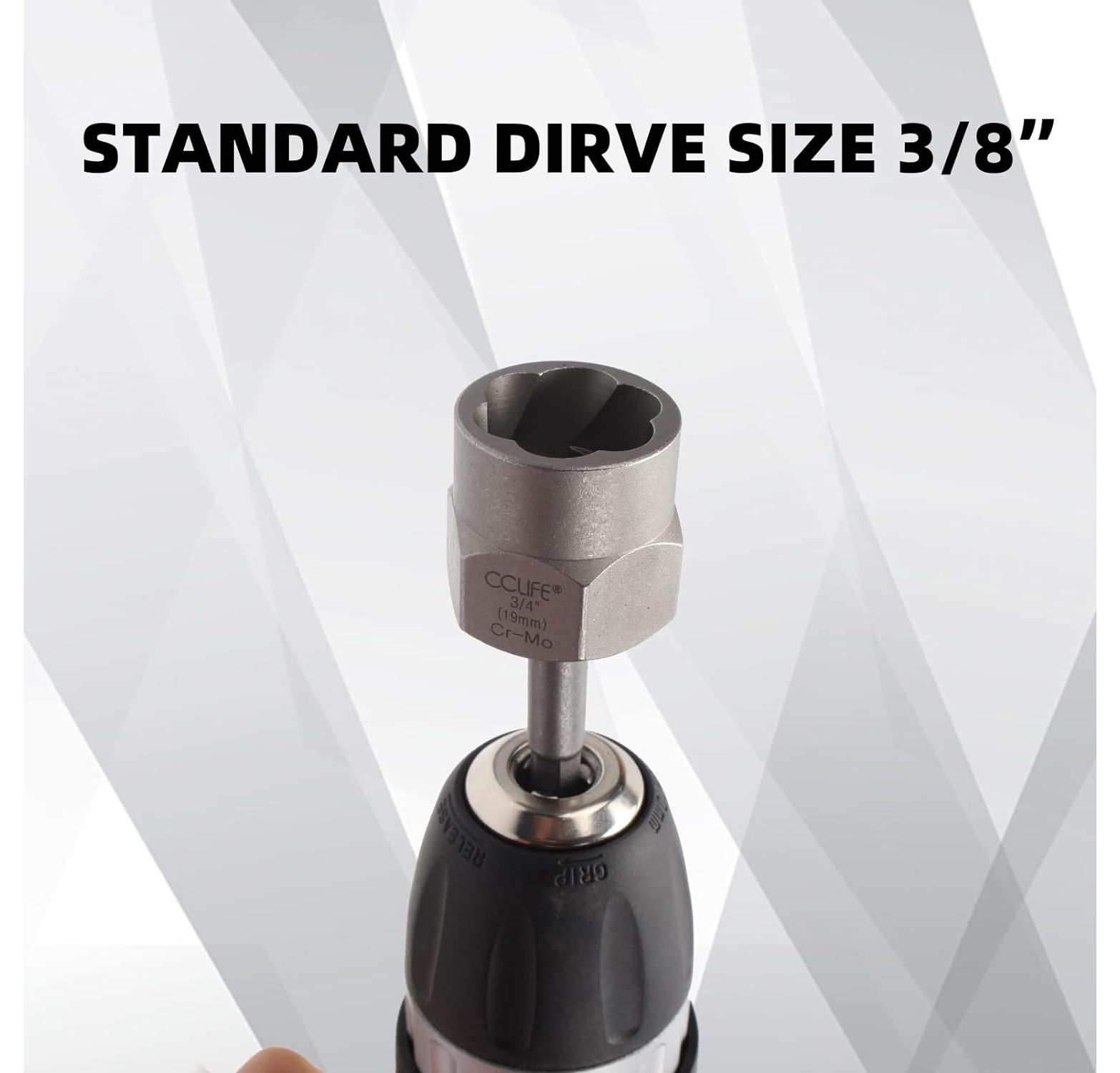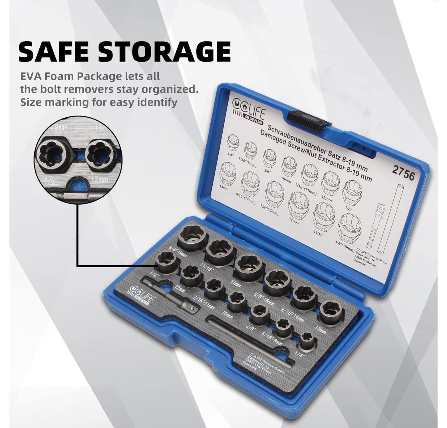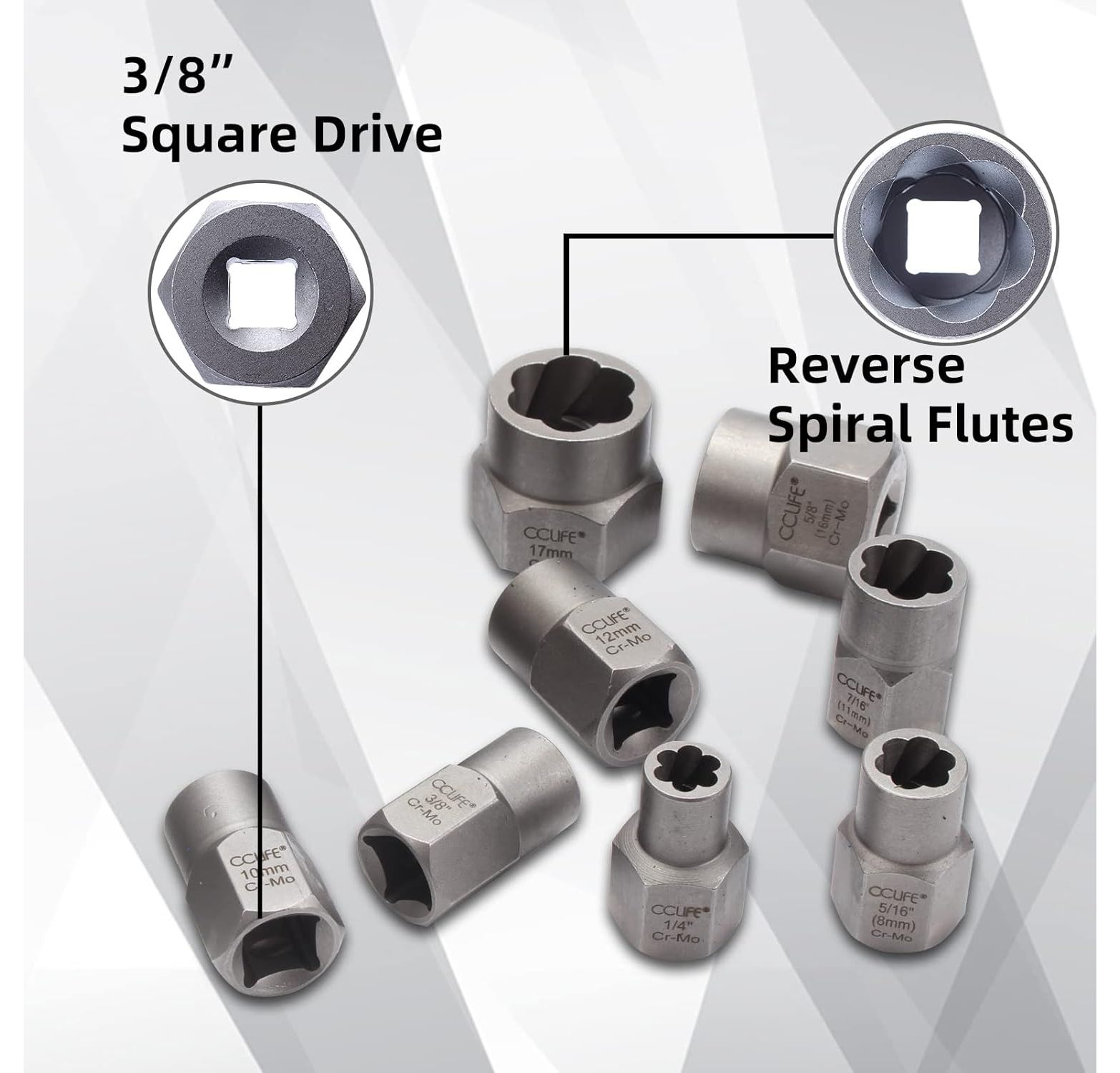 CCLIFE 15-Piece 3/8 Inch Cr-Mo Special Socket Wrench Insert Left Extractor Screw Extractor Nut Remover 8-19 mm Turbo Nuts