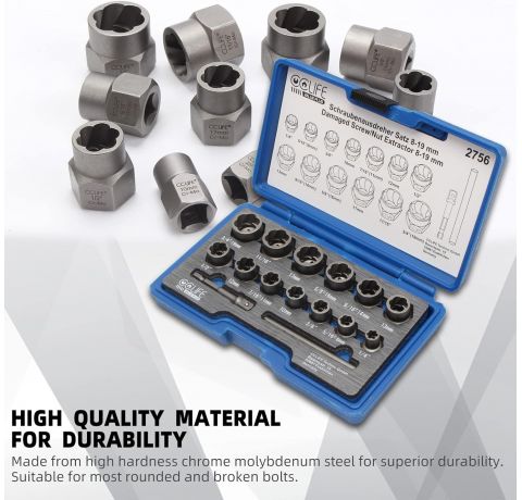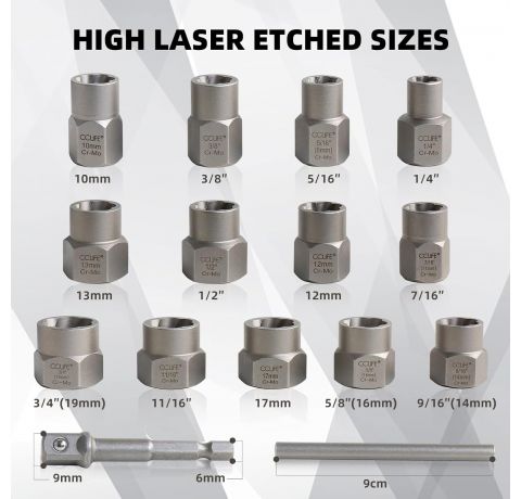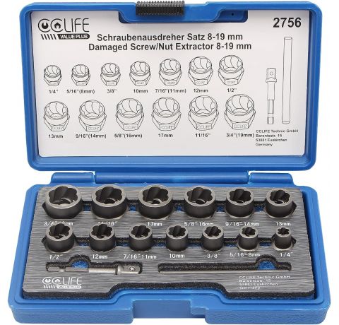 - Contents: 13-piece Cr-Mo screw remover set with sizes: 1/4 inch - 5/16 inch (8 mm) - 3/8 inch - 10 mm - 7/16 inch (11 mm) - 12 mm - 1/2 inch - 13 mm - 9/16 inch (14 mm) - 5/8 inch (16 mm) - 17 mm - 11/16 inch - 3/4 inch. 19mm)